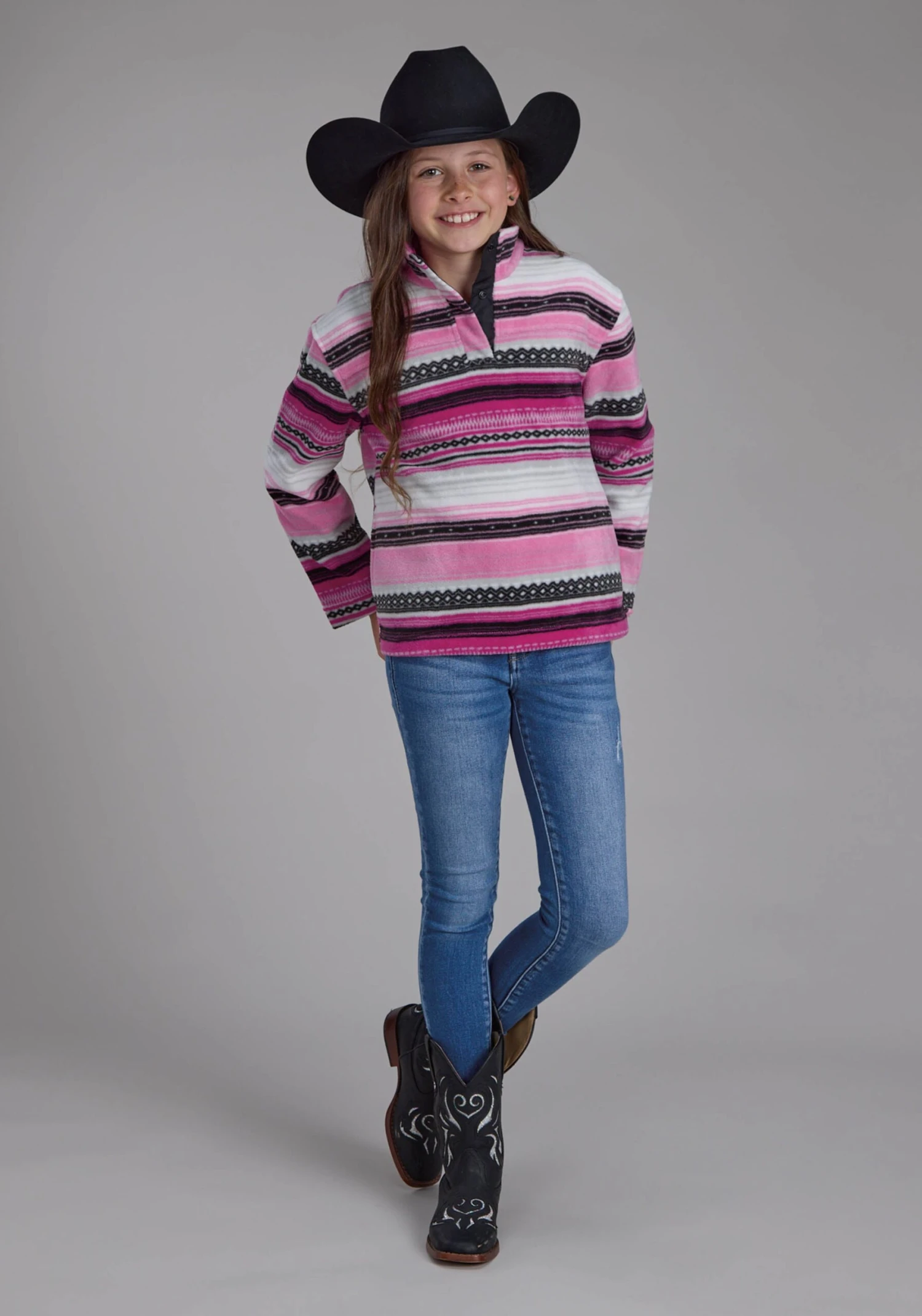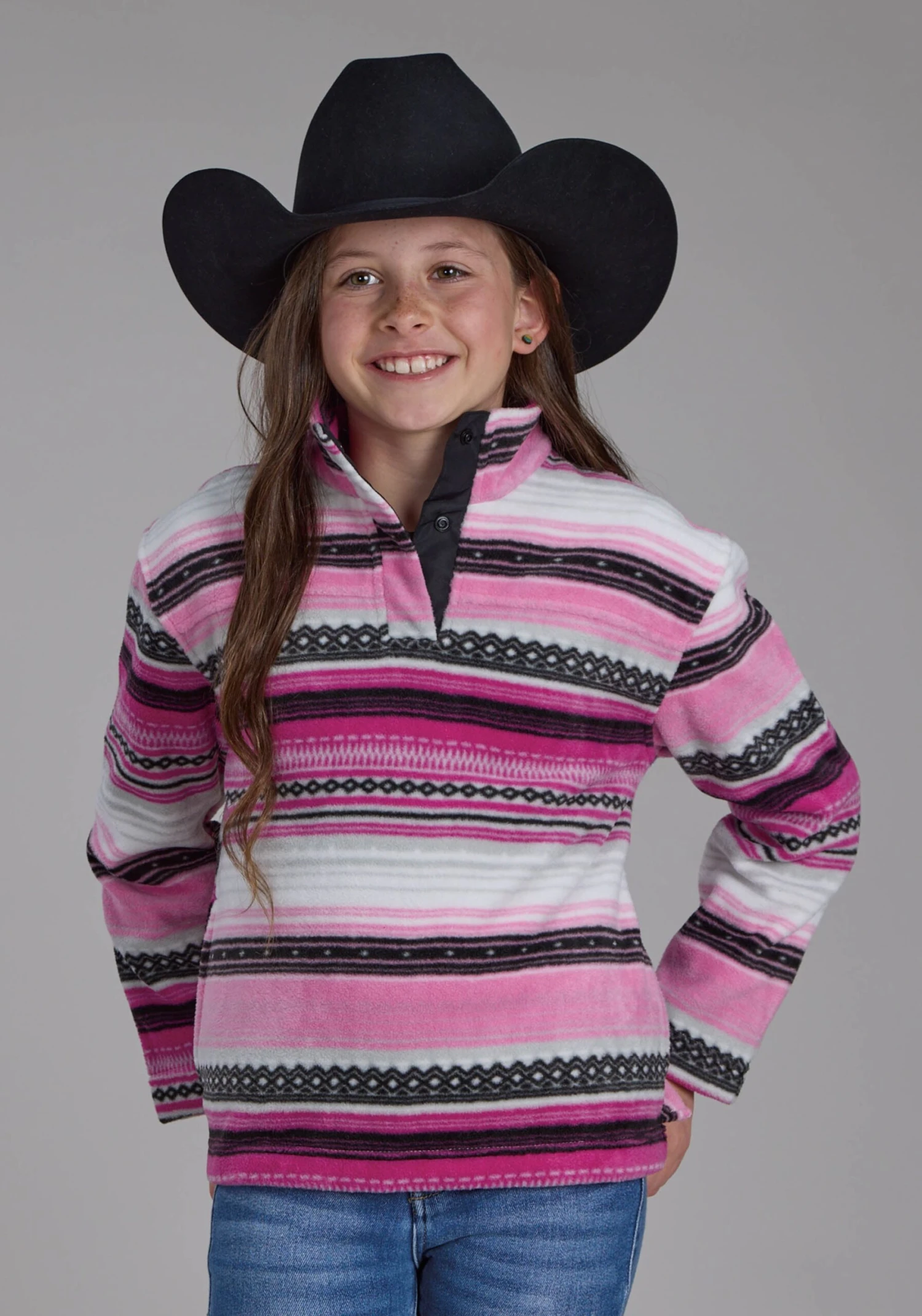 Girl’s Printed Micro Fleece Pullover * 100% Poly * Straight Front & Back Yokes * Nylon-Like Poly Center Placket W/Hidden Snaps * Stand Up Collar * Side Seam Pockets * Side Seam Slits On Hem