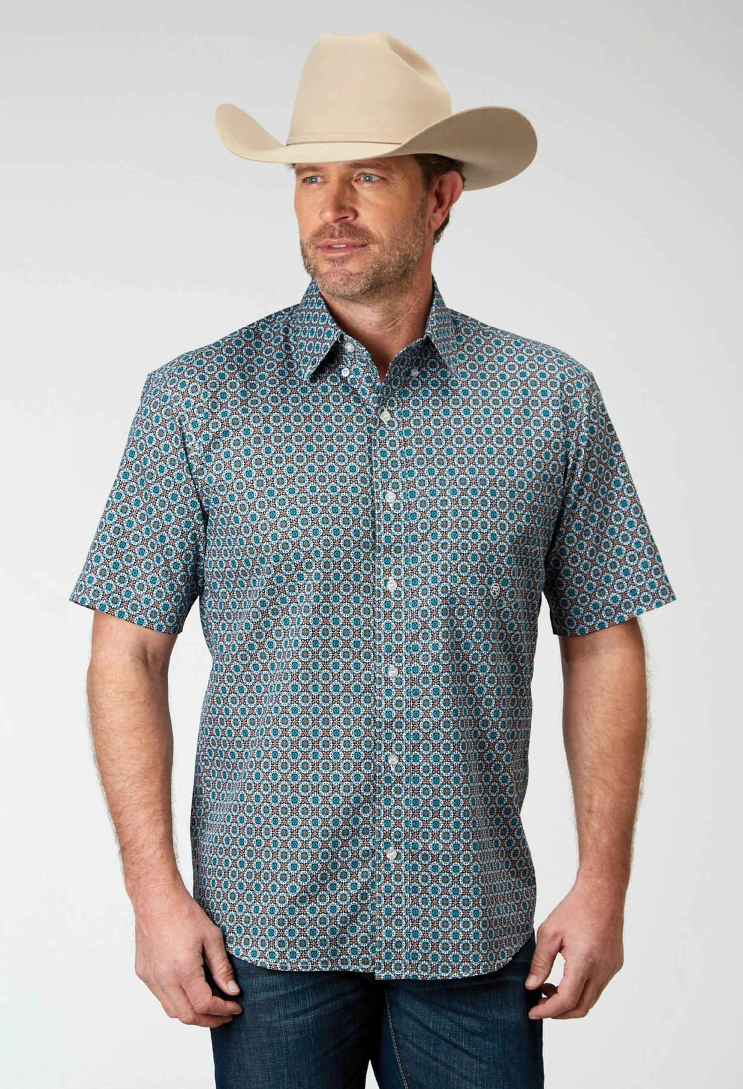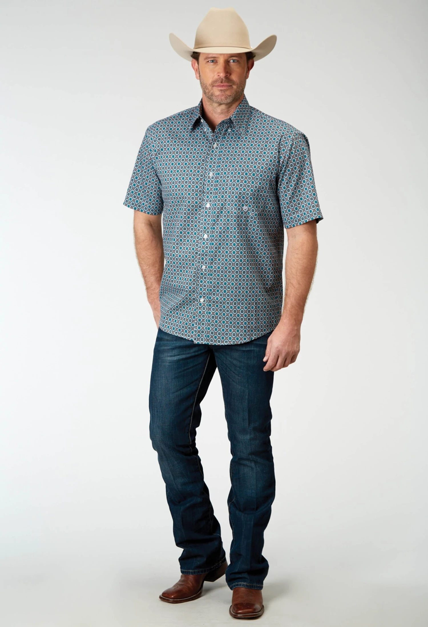 Men’s Short Sleeve Shirt * Bttn Dn Collar * Straight Back Yoke W/Pleat & Locker Loop * 1 One Point Open Pkt * Roper “R” Embroidery