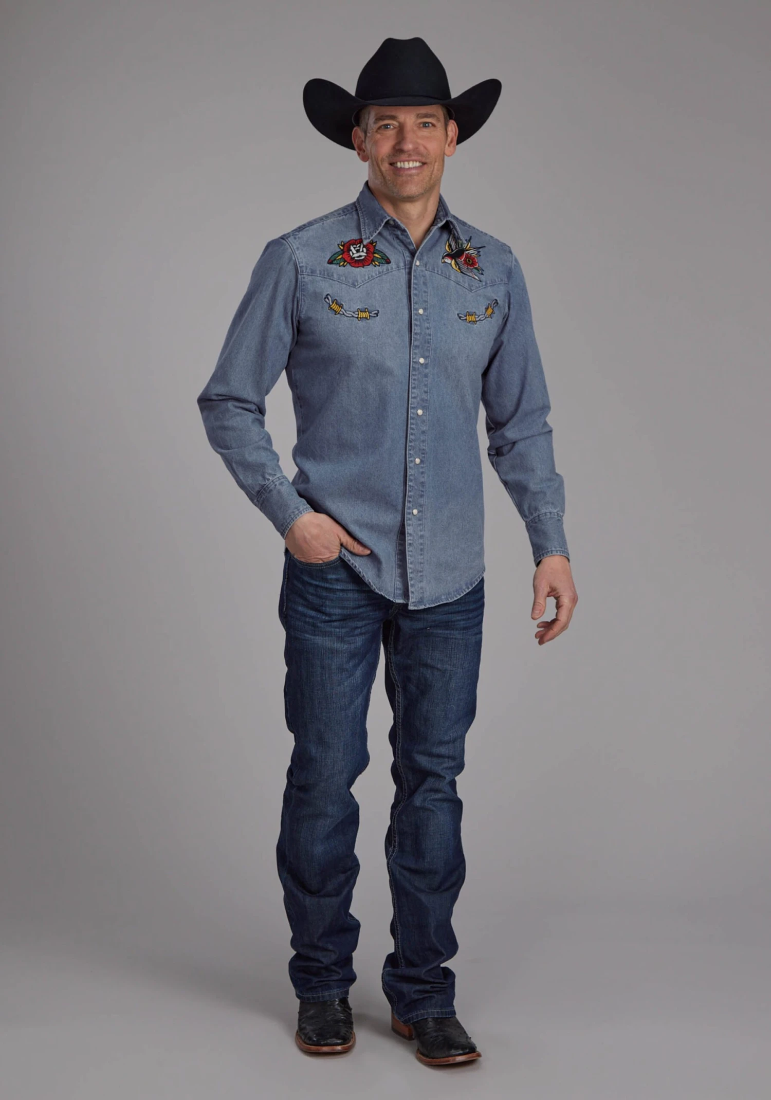 Men’s Long Sleeve Denim Shirt * 80% Cotton/20% Polyester * Tattoo Embroidery On Front & Back Yokes * Faux Smile Pocket Embroidery * 3 Snap Cuff * Snap Closure