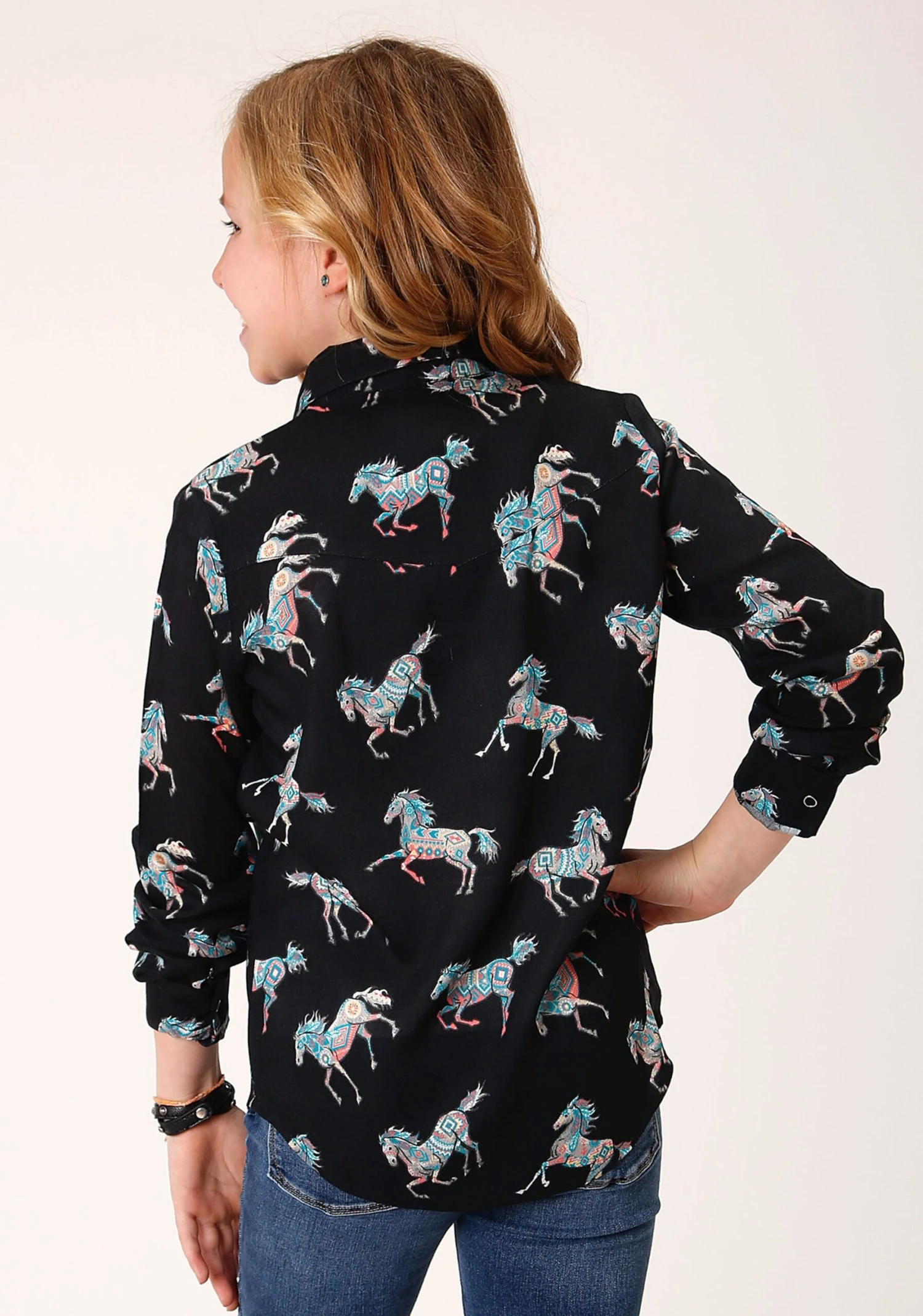 SKU: D2F5B 7857269670135 Category: Girls Tags: 100% RAYON, 1364 WILD HORSE PRT RAYON LS, 2 Pocket, APPAREL, Color: BLACK, Five Star, Five Star Girls, GIRLS, Long Sleeve, Print, PRINTED, RELATED SEPERATE, Season 5 Group 2, Snap, Tops, Woven
