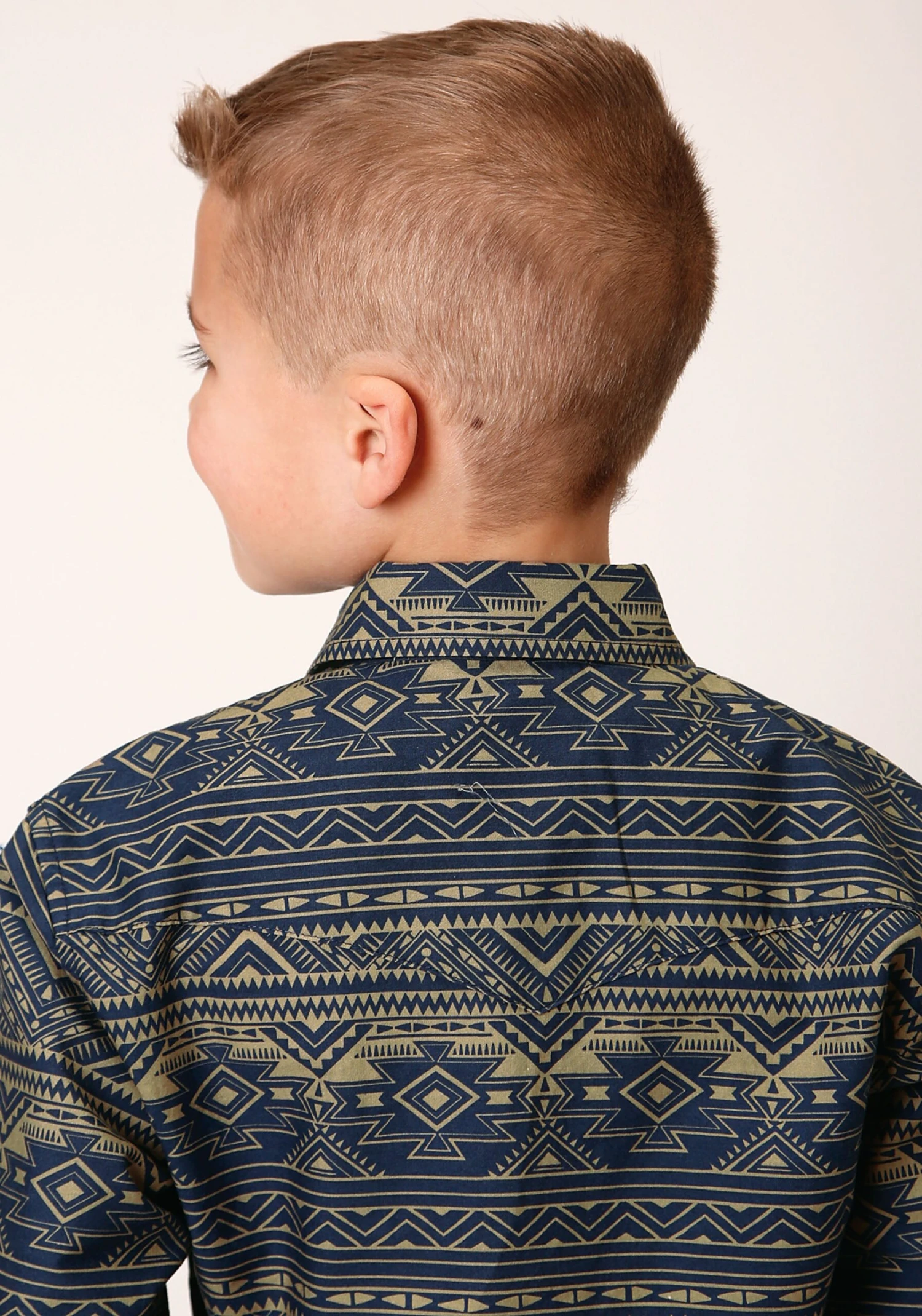 Boy’s Long Sleeve Horizontal Aztec Print Shirt * Denim Inside Trim * 1 Pt Curved Front & Back Yokes * 1 Pt Curved Pockets & Snaps * 1 Snap Cuff * Navy Opaque Snaps * Garment Washed