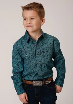 Boys Long Sleeve Western Shirt * Snap Front * Spread Collar * 1 Point Back Yoke * 2 One Point Pockets & Flaps * Roper “R” Embroidery