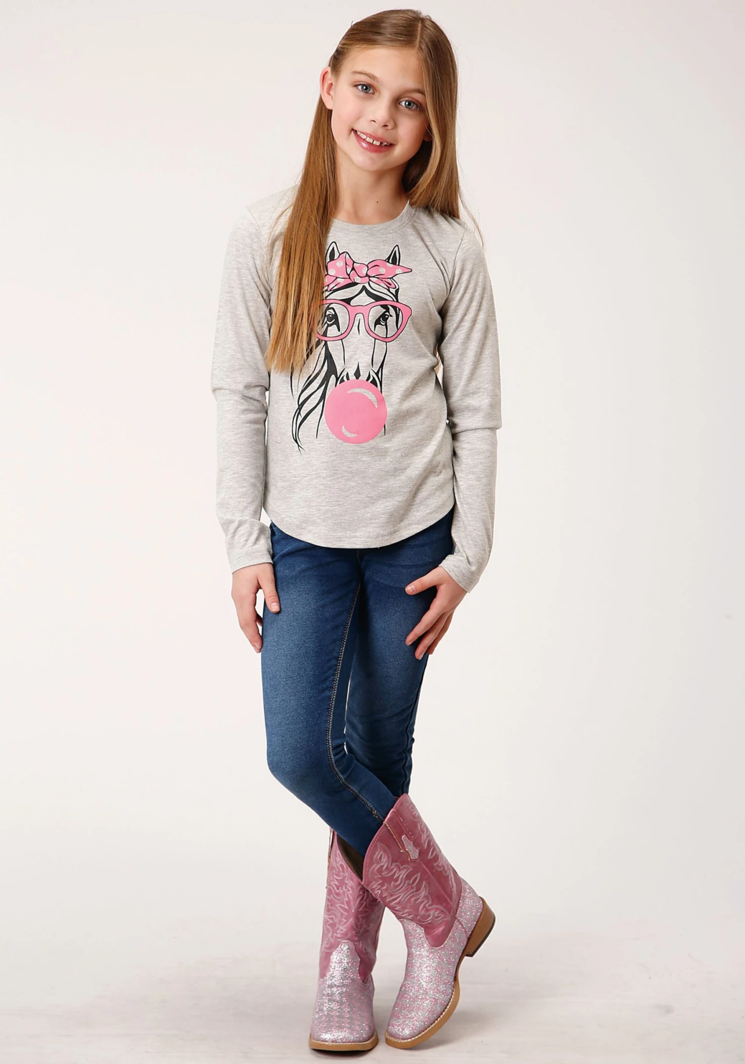 Girl’s Grey Jersey Knit Tee * Long Sleeve * Scoop Neckline * Screen Print Decoration * Garment Washed For Softness