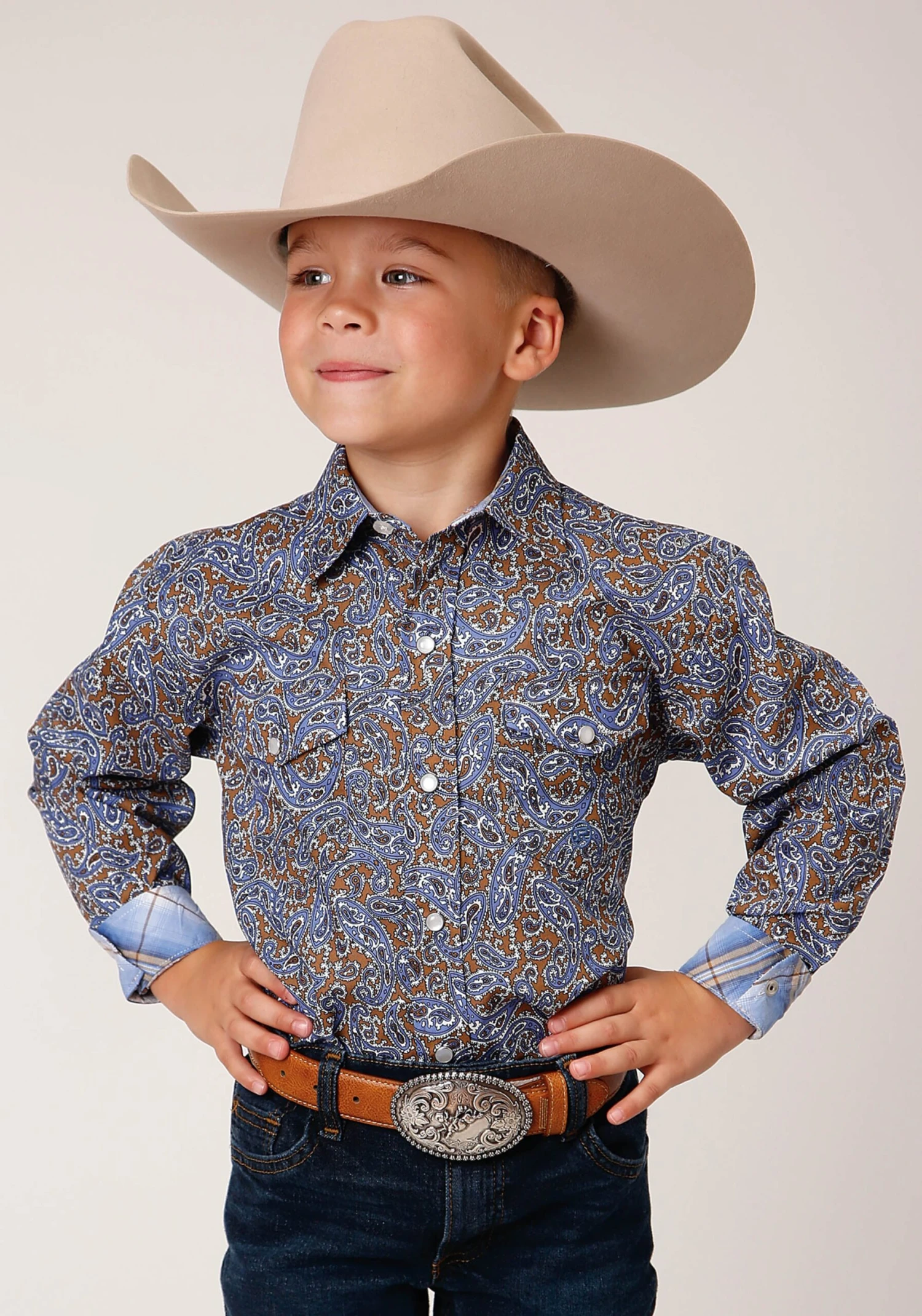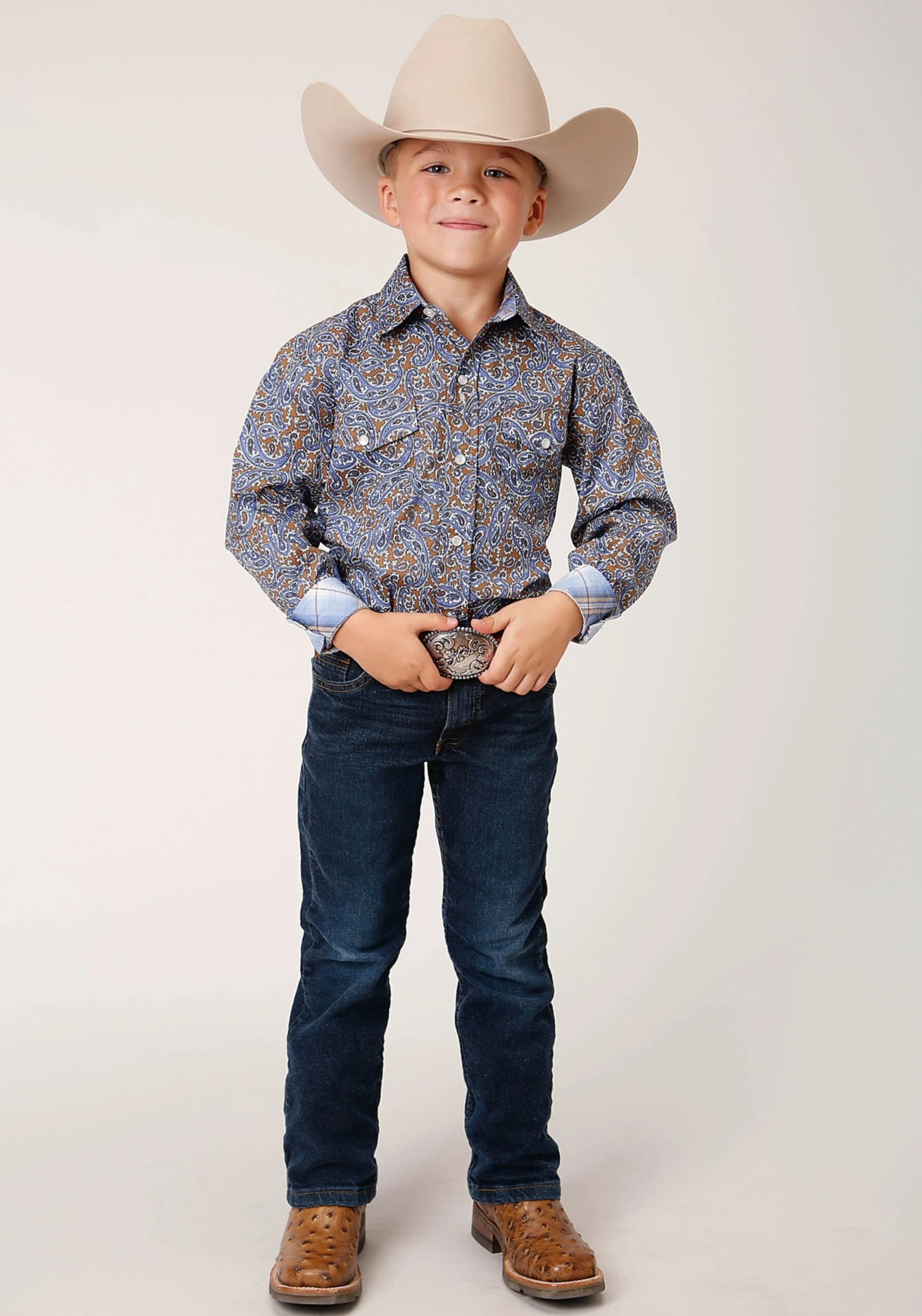 Boys Long Sleeve Western Shirt * Snap Front * Spread Collar * 1 Point Back Yoke * 2 One Point Pockets & Flaps * Roper “R” Embroidery
