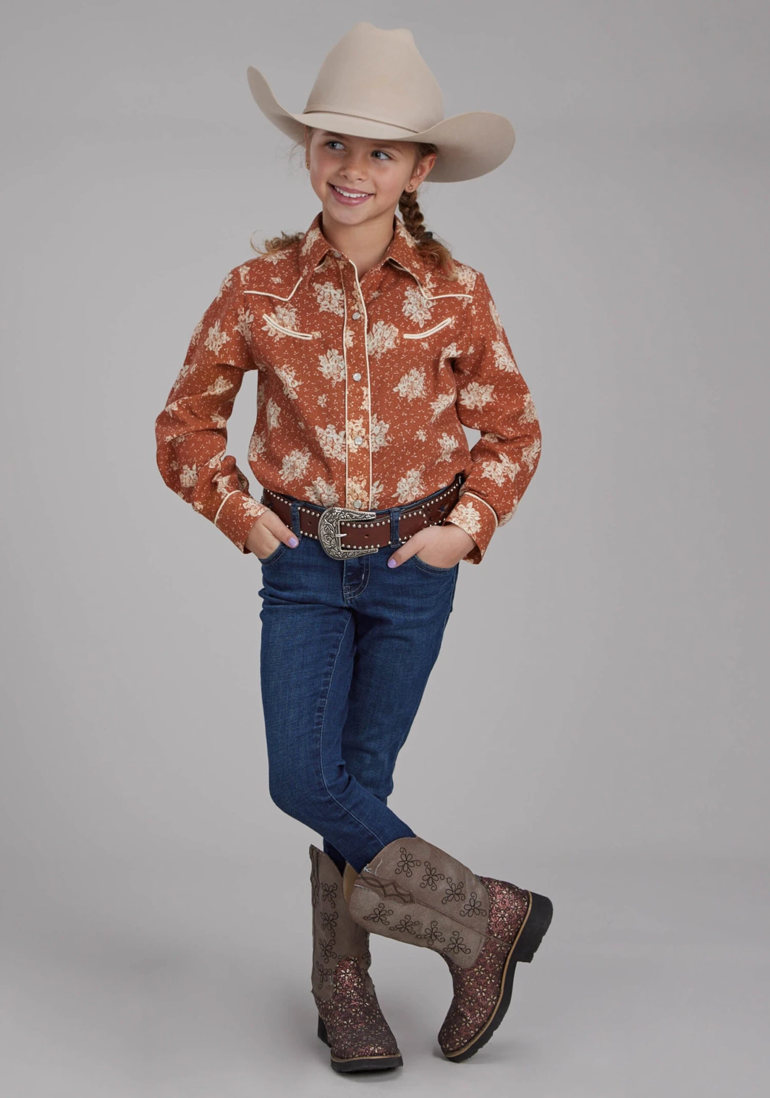 Girl’s Long Slv Western Shirt * Curved 1 Pt Back Yoke * Print Floral Cotton/Poly Broadcloth Trimmed W/Solid Cream Piping * Smile Pockets/No Arrow Points * Snap Front * 1 Snap Cuff