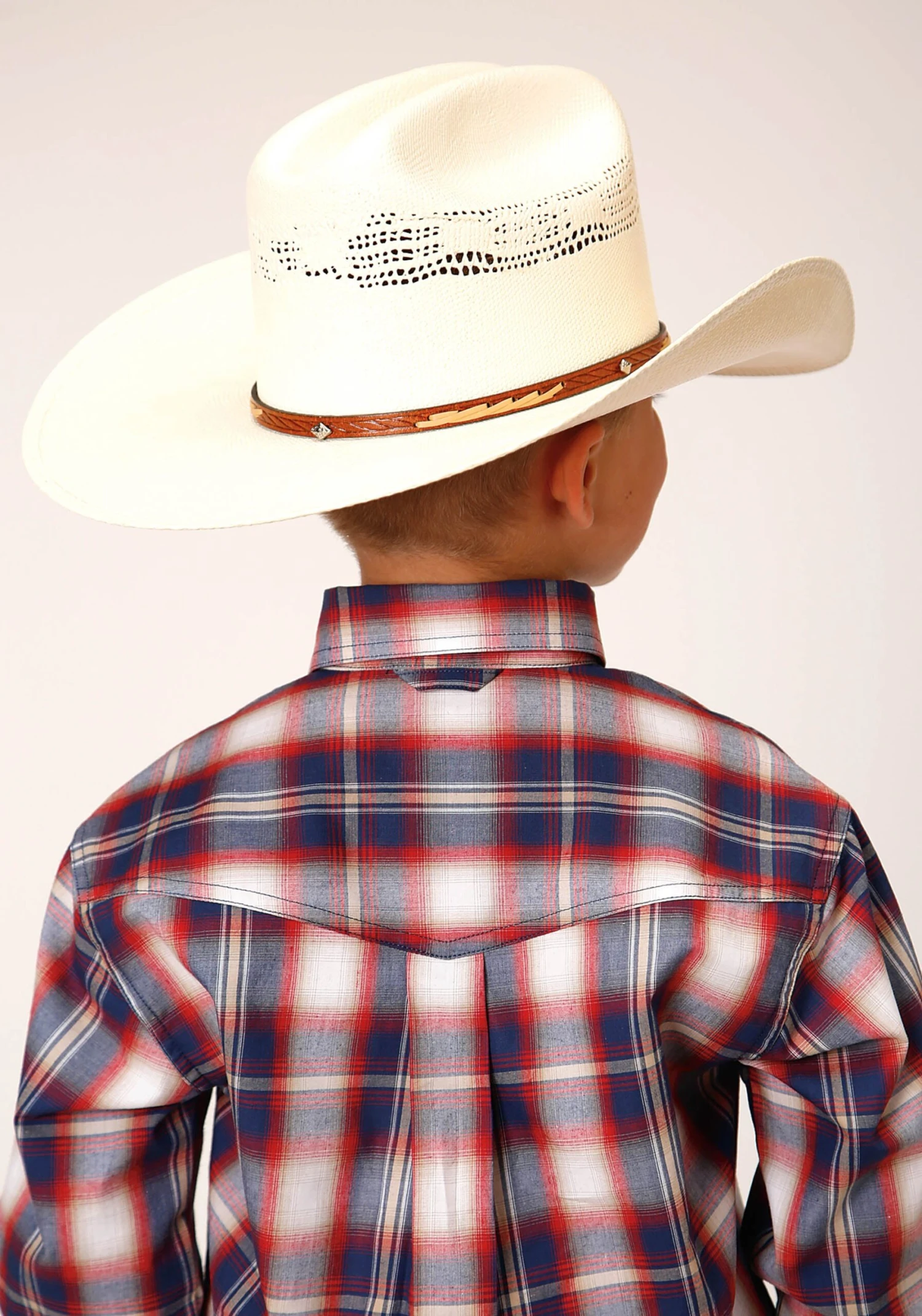 Boy’s Long Sleeve Western Shirt * Button Front * Button Down Collar * 1 Point Back Yoke W/Pleat & Locker Loop * 2 One Point Pockets & Flaps * Roper “R”