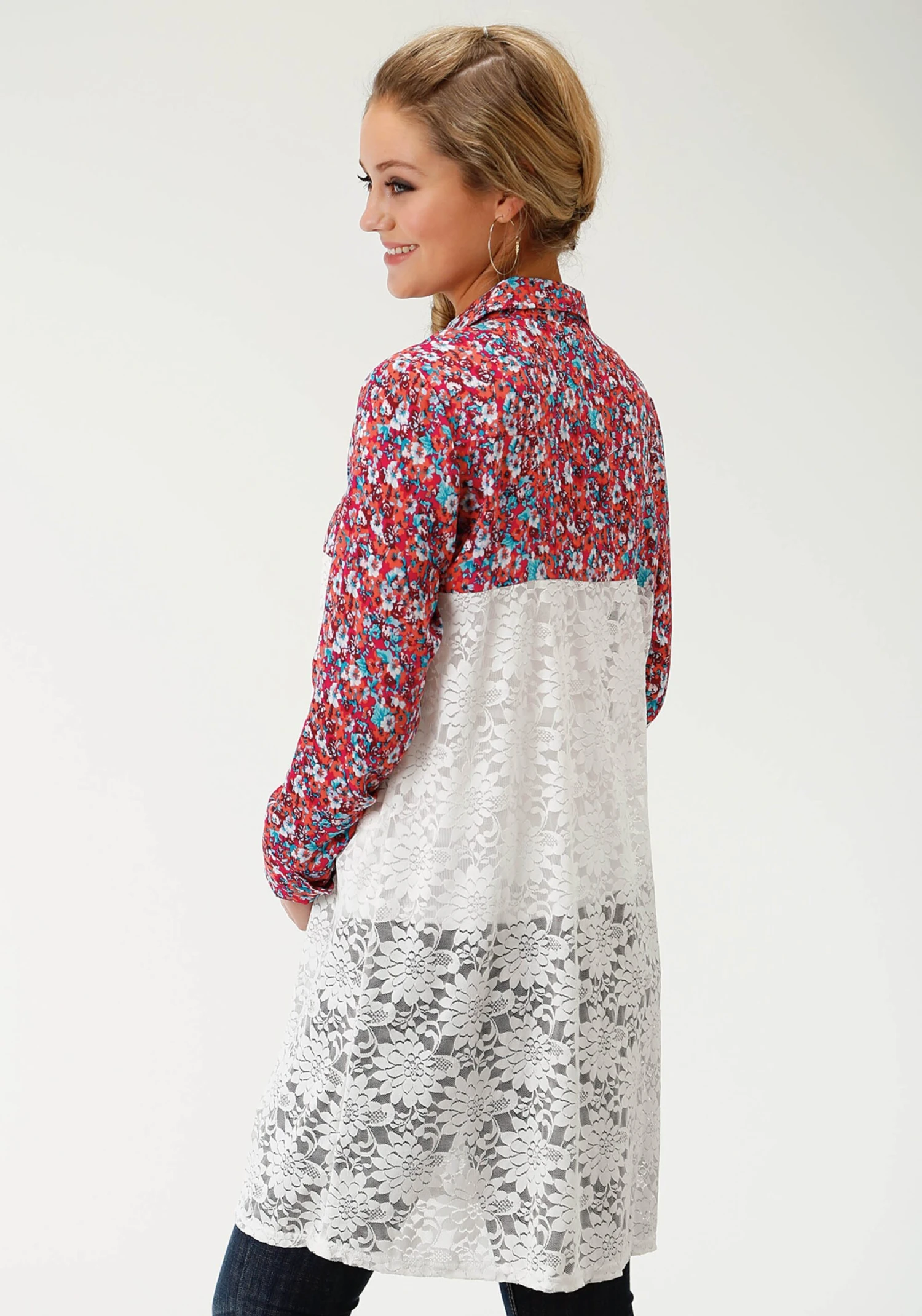 Ditsy Floral Printed Rayon L/S Western Shirt Style Duster * 1 Point Curved Front And Back Yokes With Double Needle Stitching * Pearl Snap Closure * Contrasting Lace Fabric Bottom Panels