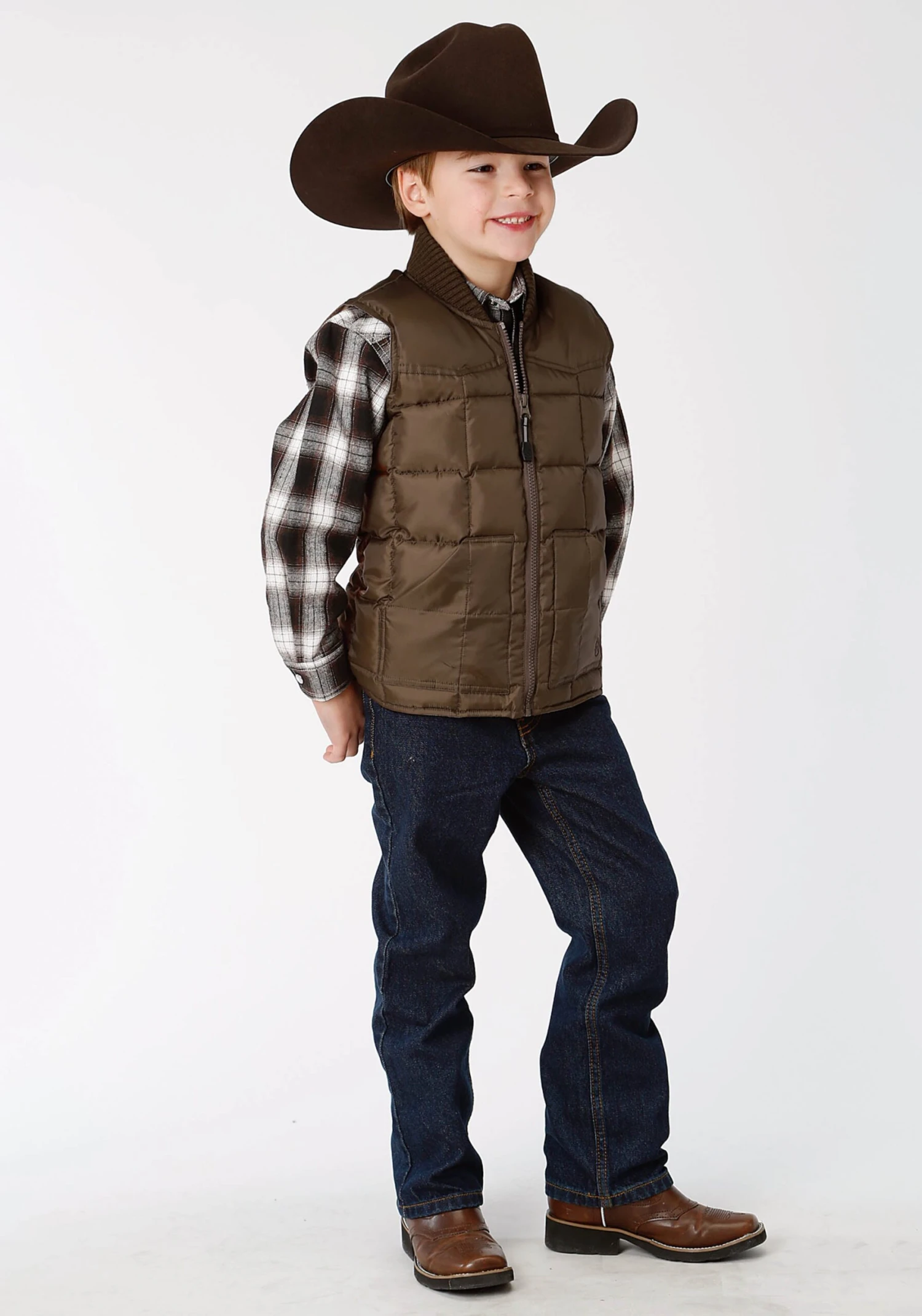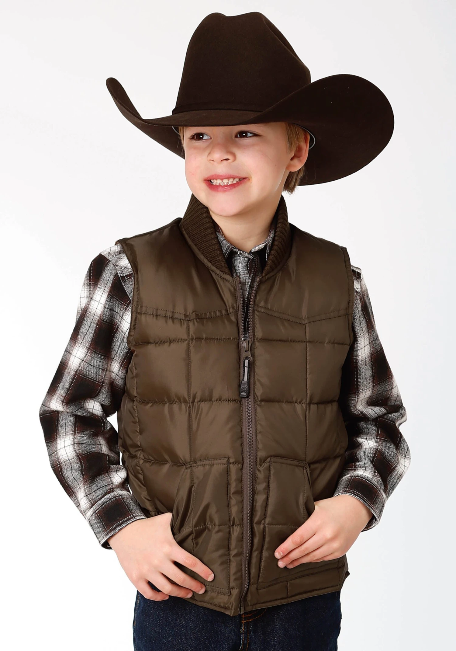Boy’s Price Point Poly Vest * Poly Filled * 1 Pt Front & Back Yokes Featuring Self Fabric Piping * Rib Knit Collar * Large Front Cargo Style Pockets * Window Pane Quilting Lines * Zip Front * Reflective Zipper Pulls * Embroidered Logo