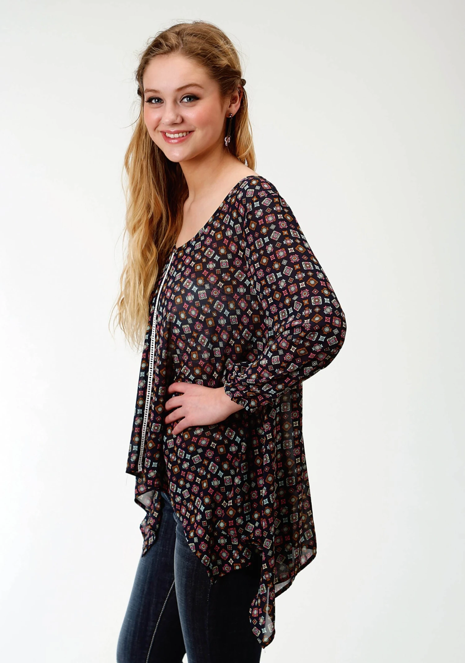 Printed Rayon Ladies V Tunic * Handkerchief Hem * Crochet Trim Inset Down Center Front *