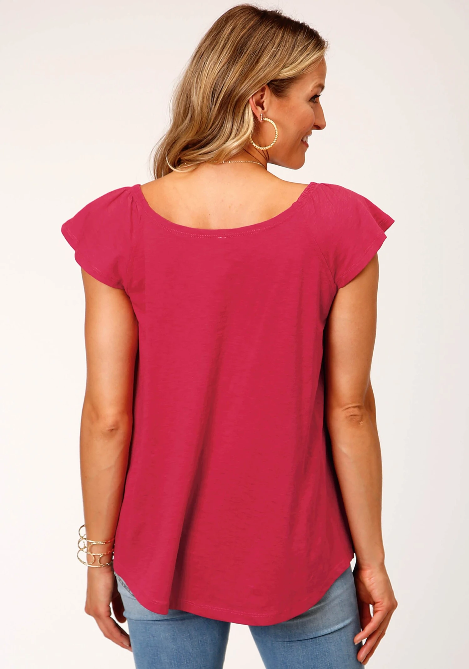 Women’s Short Raglan Flutter Sleeve Top In Raspberry Cotton Slub Jersey * Gathers At Shoulder Neckline * Embroidered