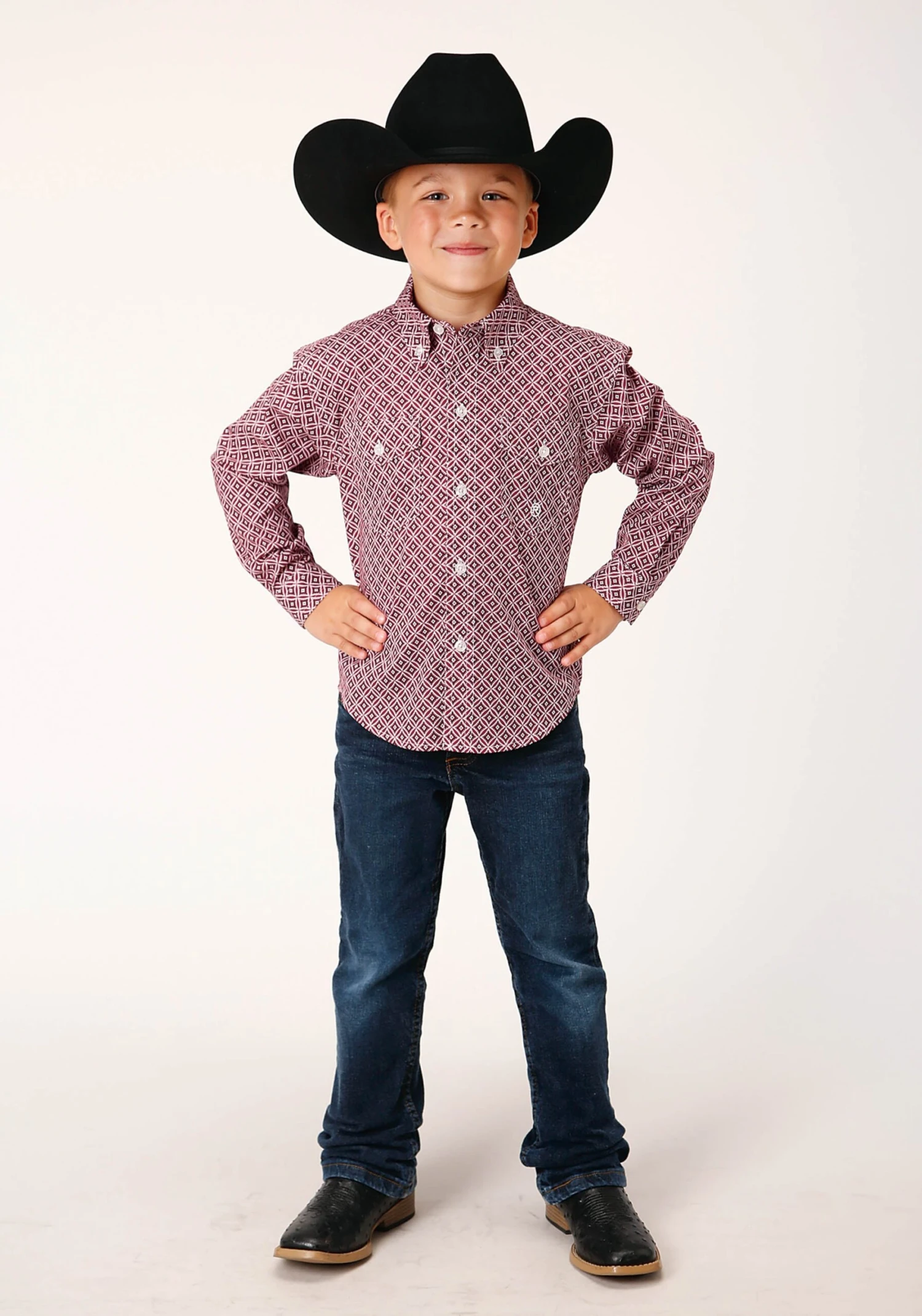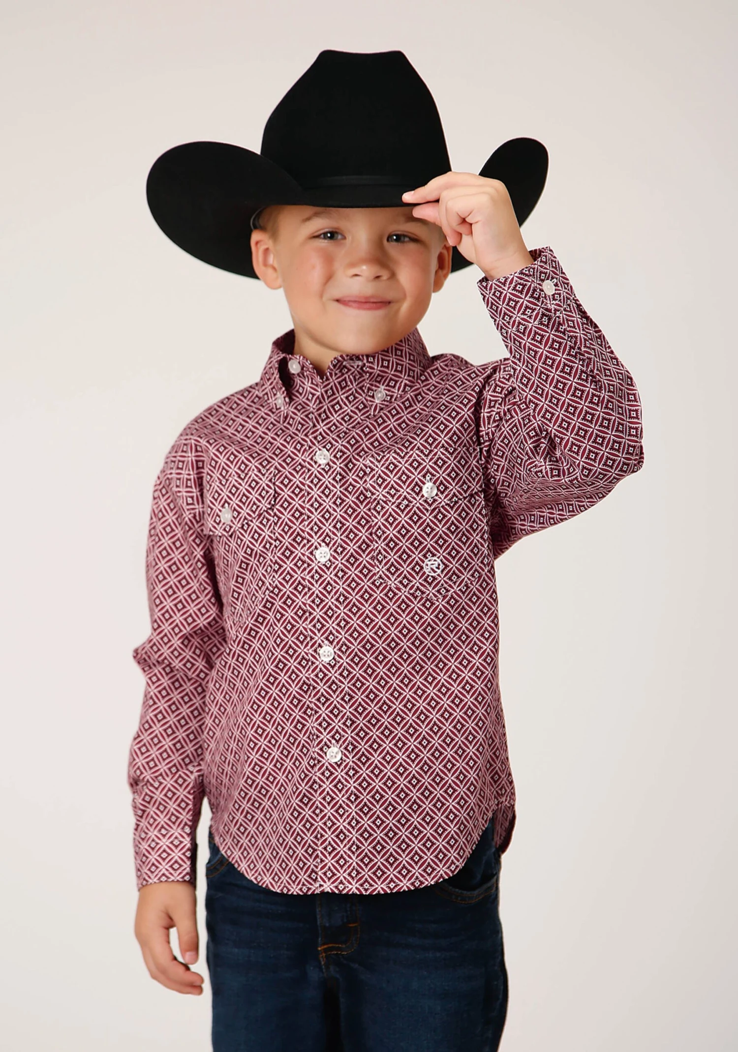 Boy’s Long Sleeve Western Shirt * Button Front * Button Down Collar * 1 Point Back Yoke W/Pleat & Locker Loop * 2 One Point Pockets & Flaps * Roper “R”