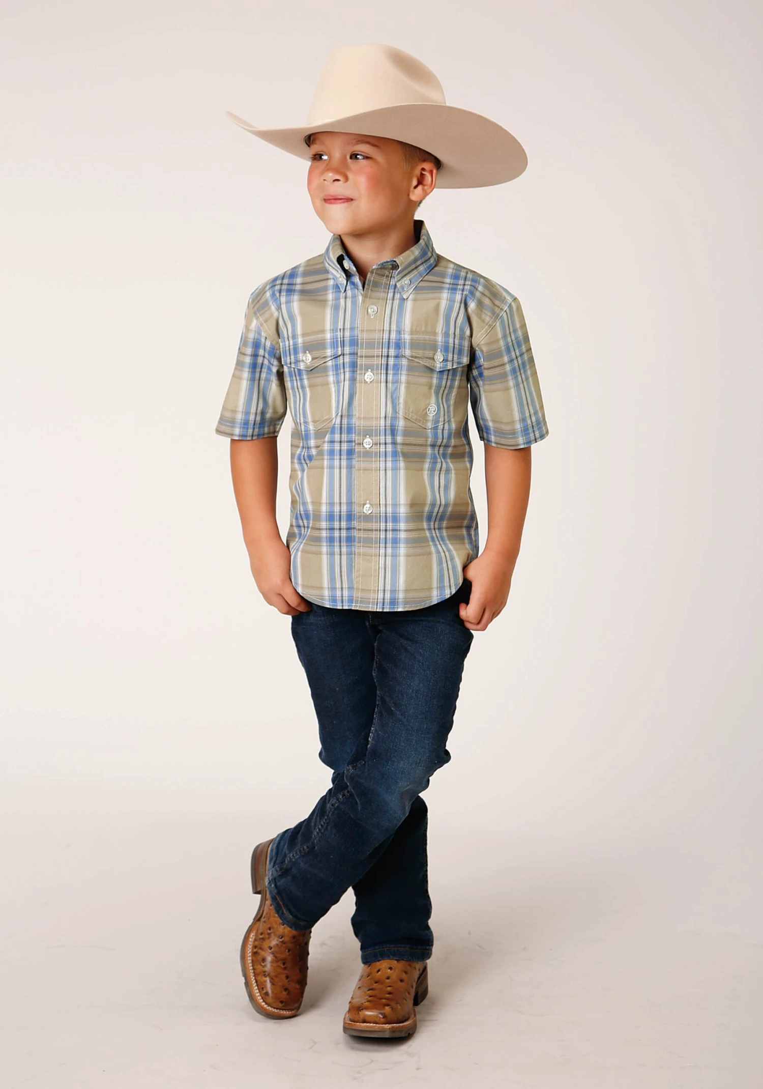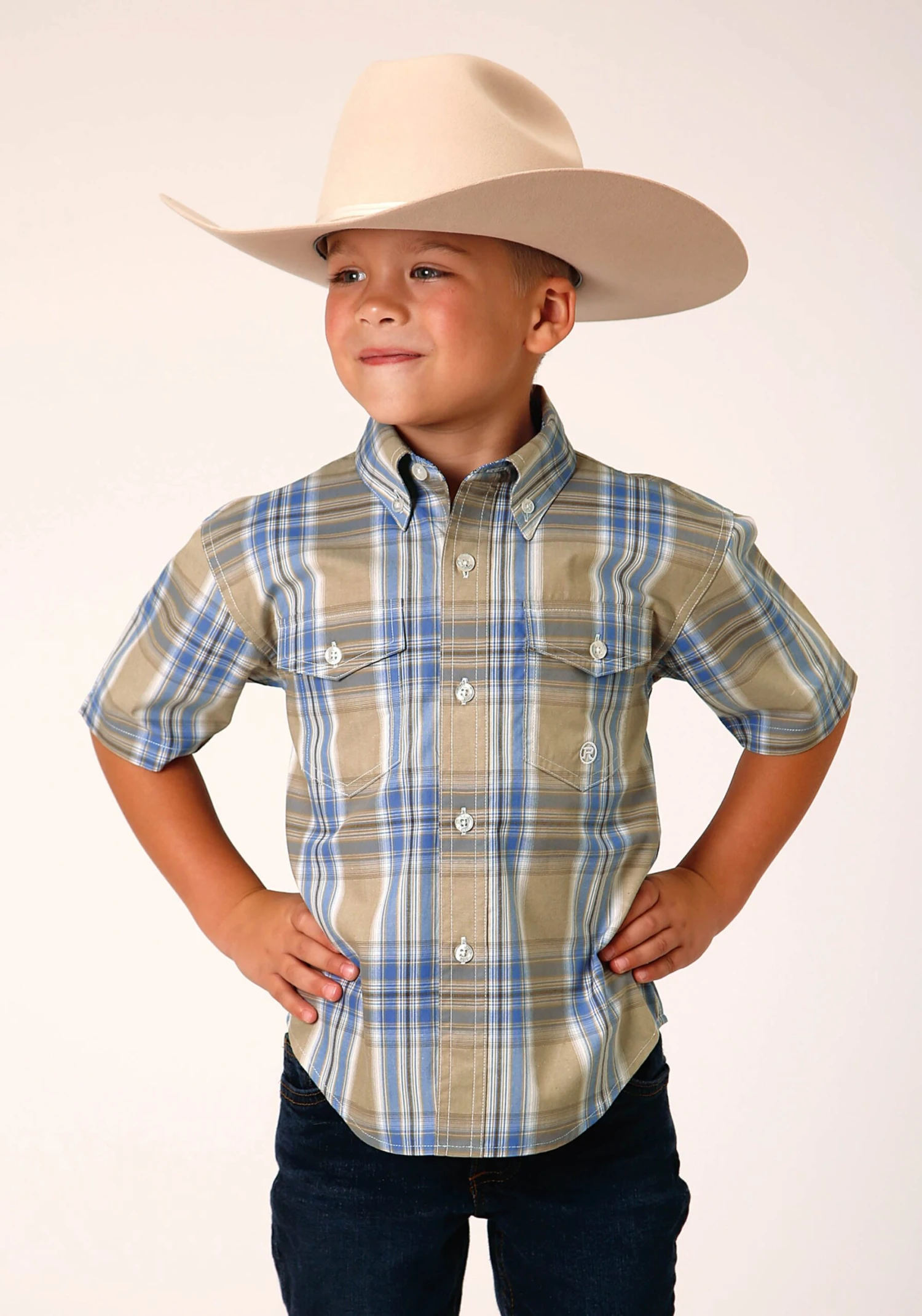 Boy’s Short Sleeve Western Shirt * Button Front * Button Down Collar * 1 Point Back Yoke W/Pleat & Locker Loop * 2 One Point Pockets & Flaps * Roper “R” Embroidery