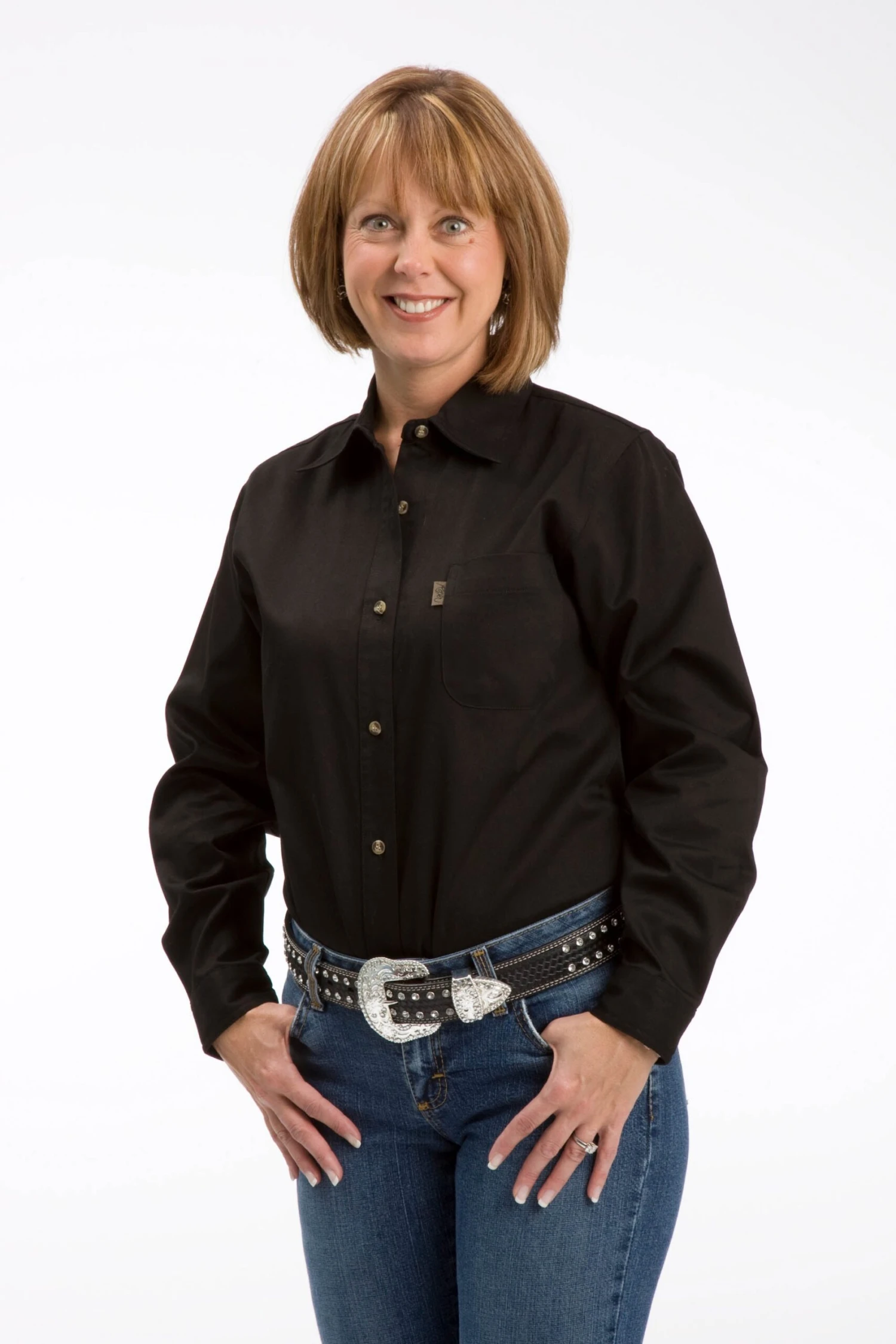 SKU: D2F5B 7517477994743 Categories: Tops, Women Tags: 100, APPAREL, Banded Collar Solid Color, Closure:Button, Color: BLACK, Long Sleeve, SOLID TWILL BTN FRONT/BTTN COLLAR, Tops, TWILL, Type:Long Sleeve, WOMENS, Woven