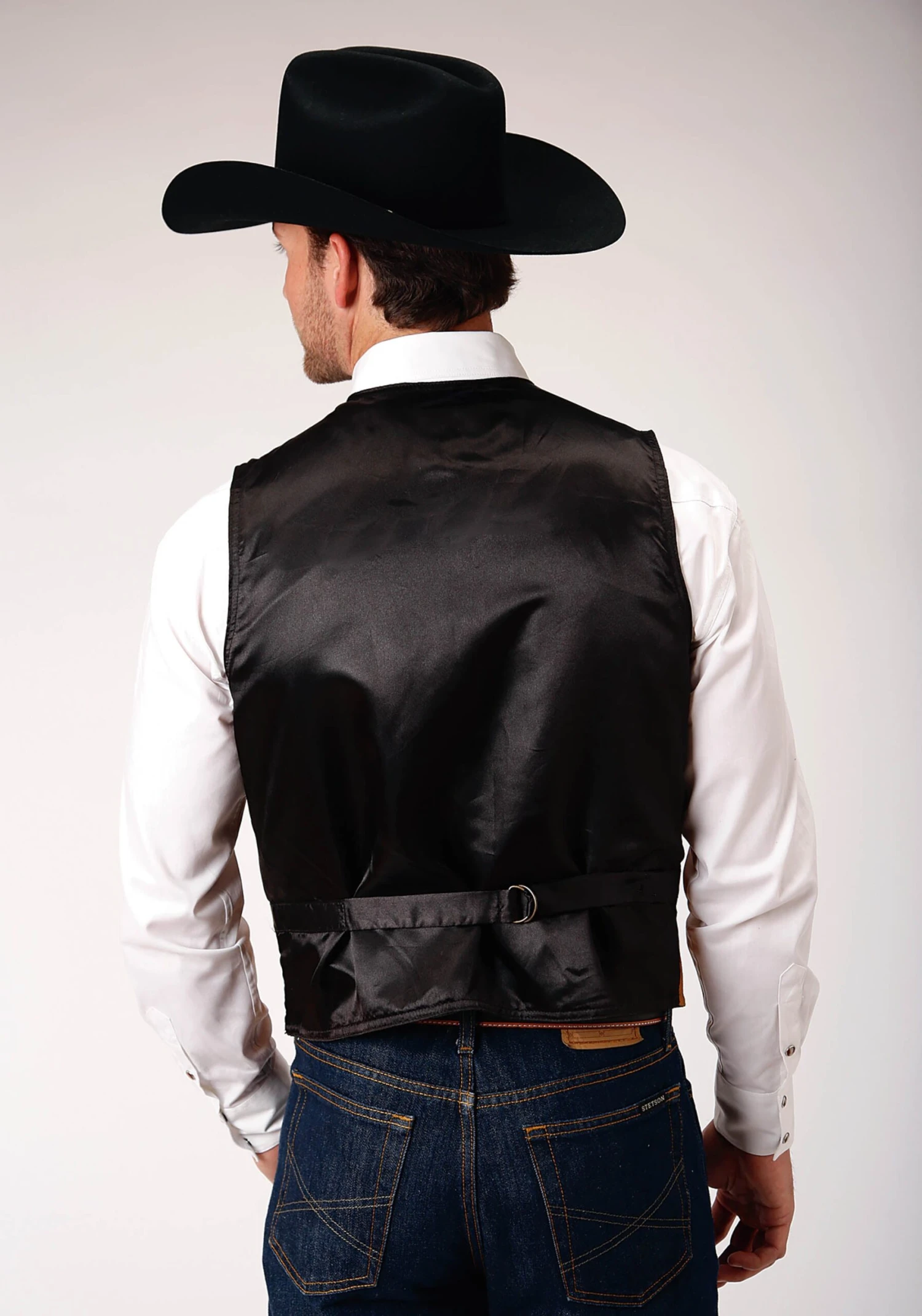 Classic Suede Vest * Satin Back W/Adjustable Buckle Tie * Antique Brass Embossed Snaps * Single Welt Front Pockets *