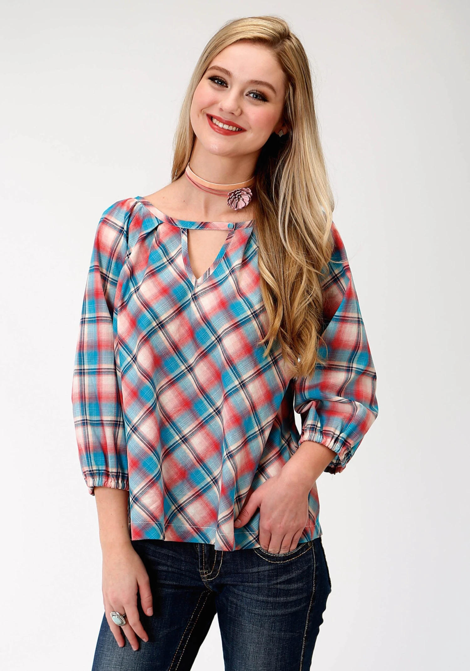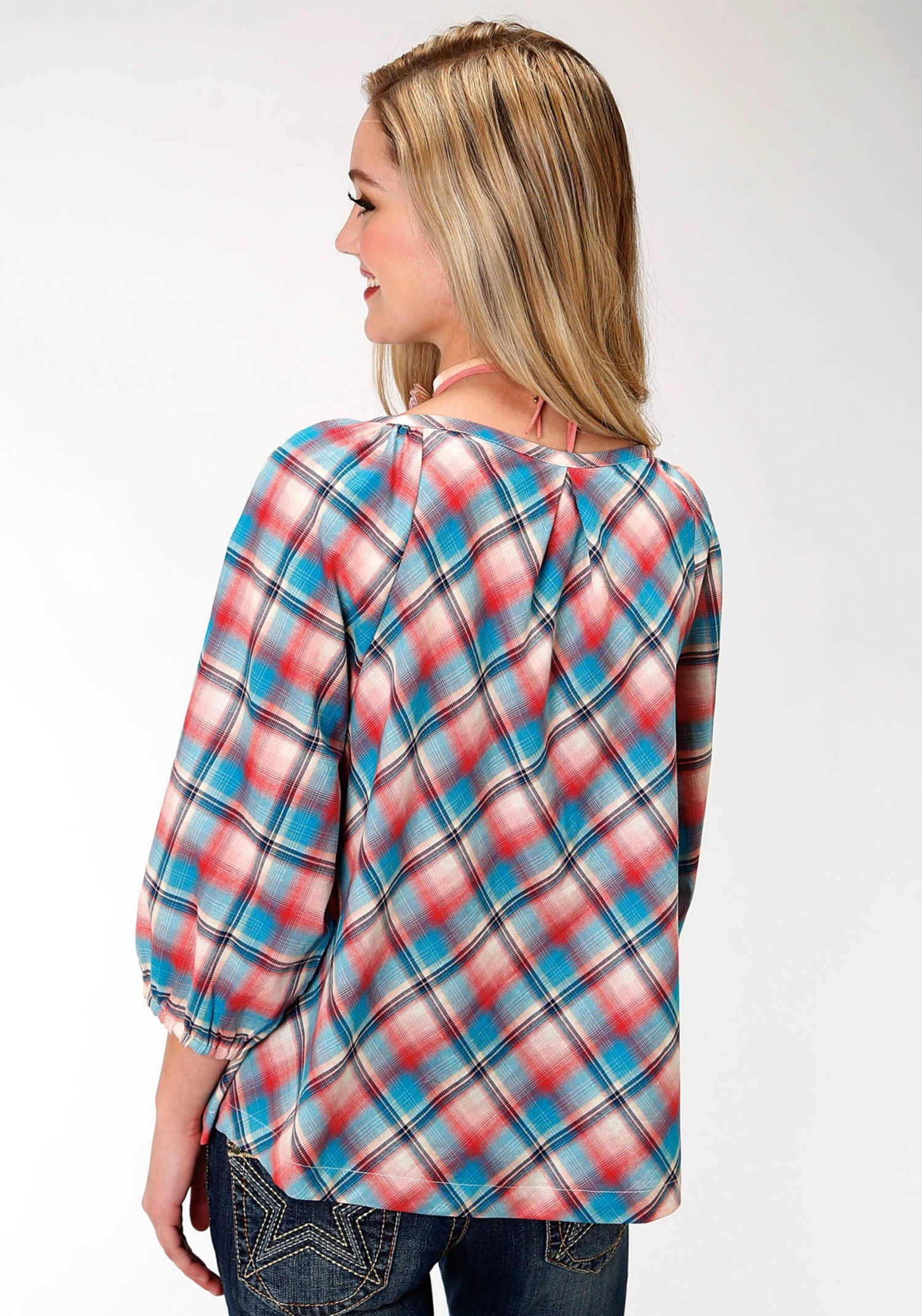 Desert Sunrise Plaid Ladies Peasant Blouse * Raglan Sleeve With Elastic Cuff * Keyhole Front Opening * Garment Washed For Softness