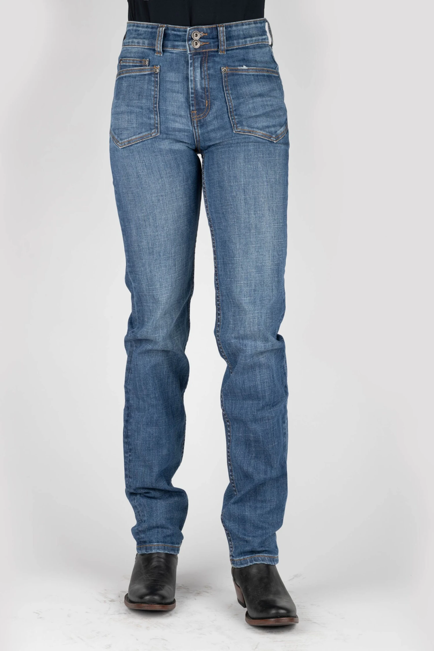 High Rise Straight Leg Fit Jean * Sits Just Below Waist * Coin Pocket And Oversized Patch Pockets On Front * Plain Back Patch Pockets * Stetson Branded Buttons, Rivets, And Zipper * Gentle Sanding And Whisker Details