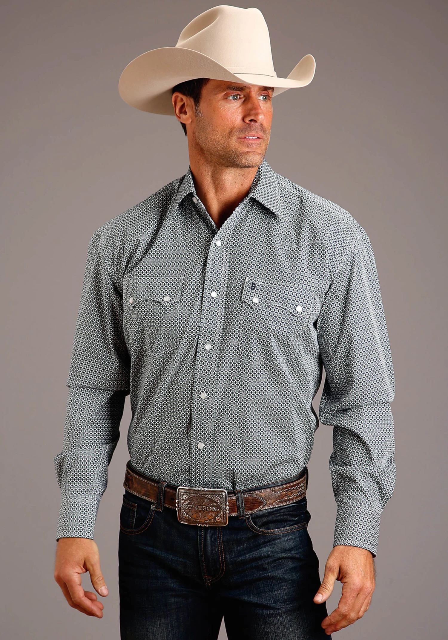 Allover Foulard Print On Cotton Poplin * 1 Pt Ultra Deep Curved Back Yoke * Stetson “S” Emb * “Stetson” Emb On Rt Slv Placket * Contrast Inside Trim * 3 Snap Cuff * Classic Snap Front Featuring Logo Pearl Snaps