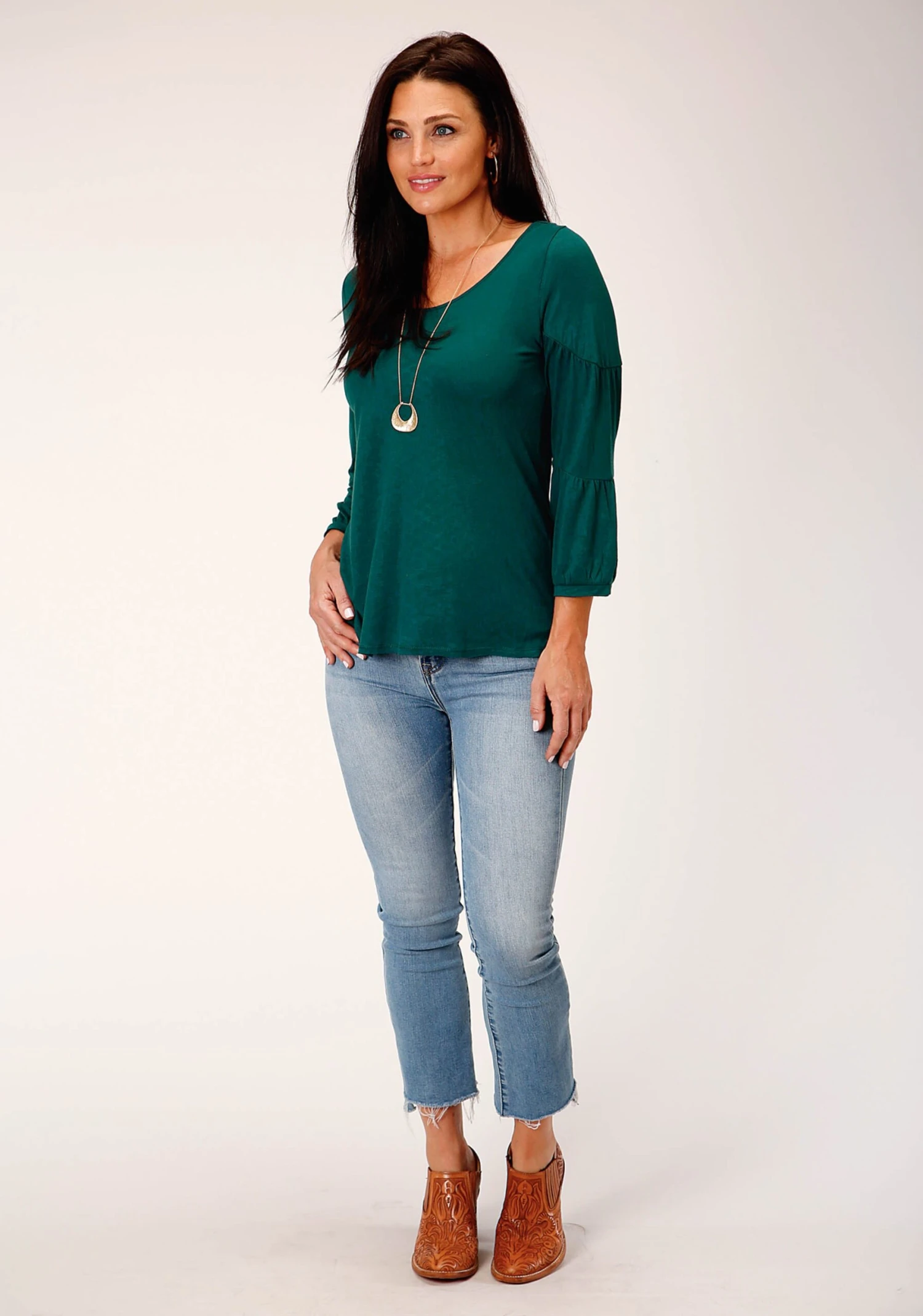 Women’s Jade Green Rayon Jersey Knit Pull Over Blouse * Scoop Neckline * ¾ Length Sleeves With Tiered Ruffle Sections And Thin Cuffs