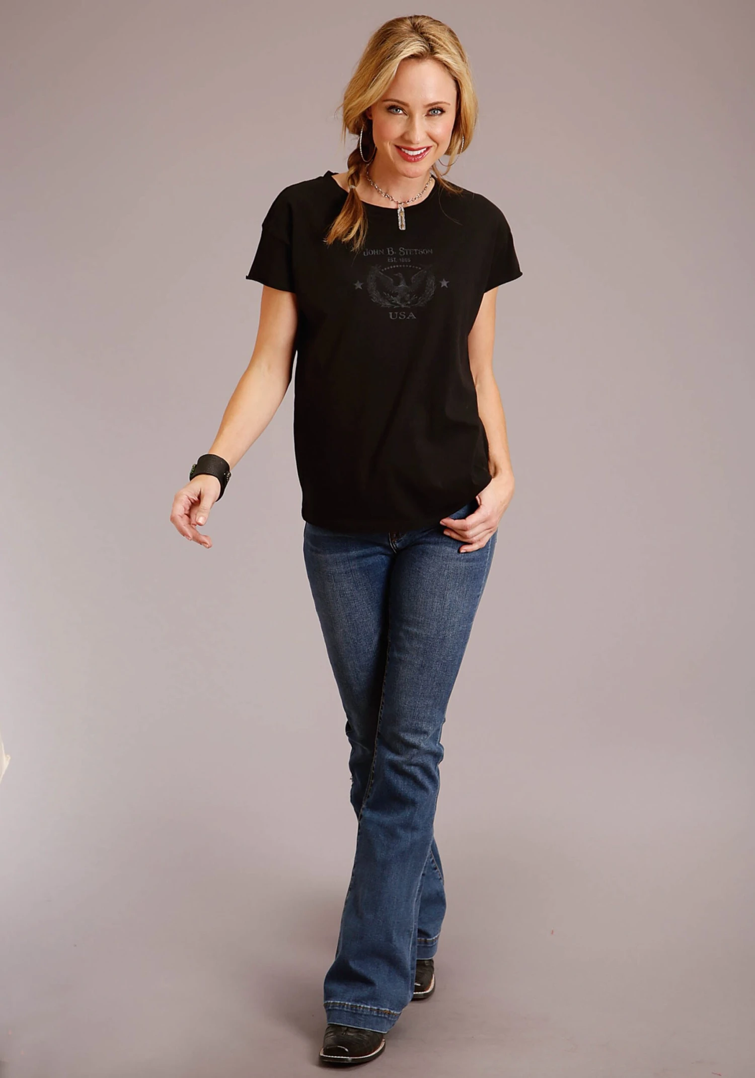 Women’s Black Short Sleeve T-Shirt * Crew Neck W/Self Collar Band * Raw Edge Short Sleeves * Garment Washed For A Super Soft Hand * Durable Cover Stitched Hem * Show Through White “John B. Stetson” & Eagle Screen Print Embellishment On Frt