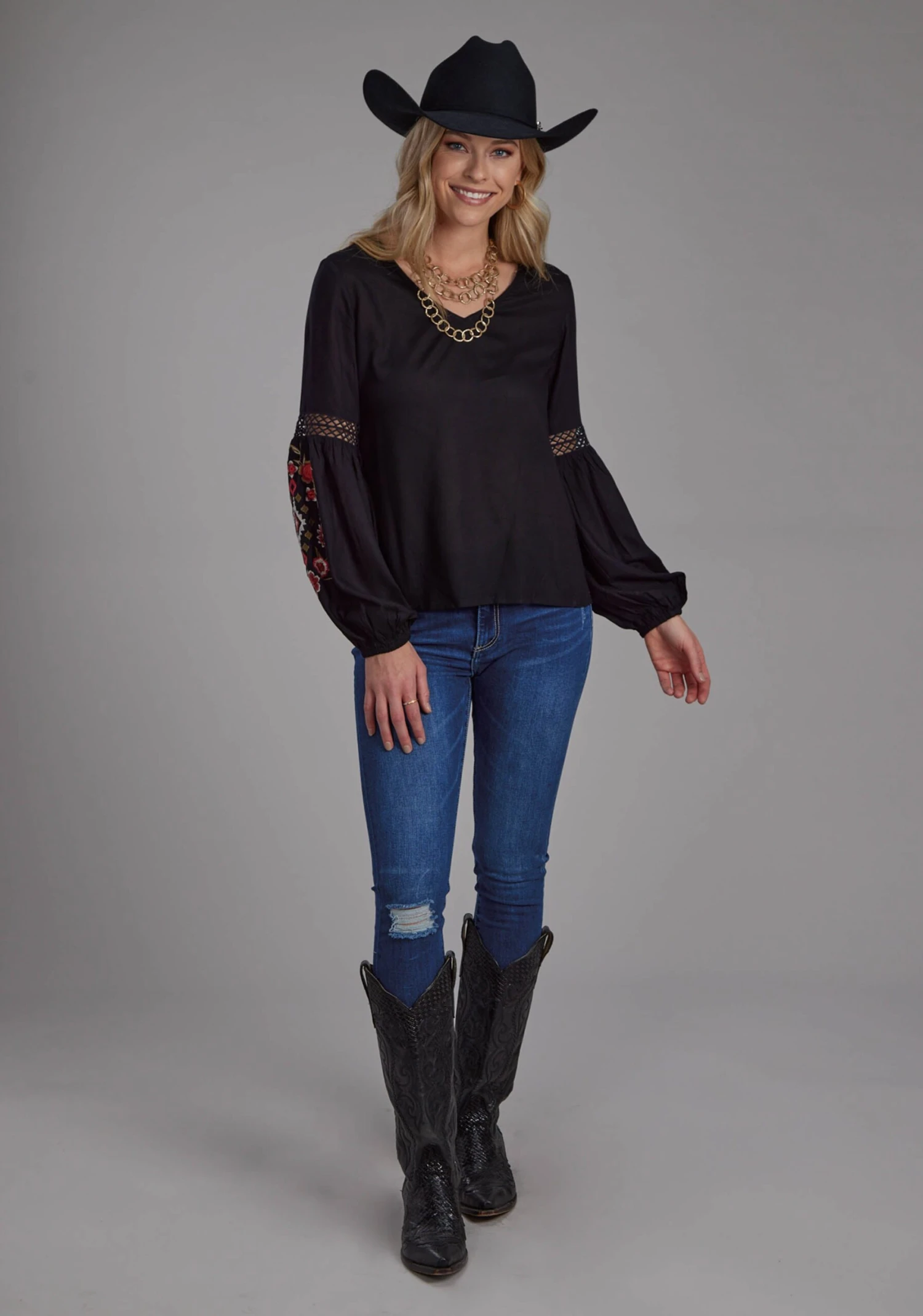 SKU: D2F5B 9529629114615 Categories: Tops, Women Tags: 100% RAYON, APPAREL, Color: BLACK, EMBROIDERY/APPLIQUE/NOVELTY FABRIC, Fall Group 1, Fall24, Long Sleeve, PULLOVER, Roper Woven, Solid, Studio West, Studio West Collection - Fall I, Tops, WOMENS, Woven, YARNDYE