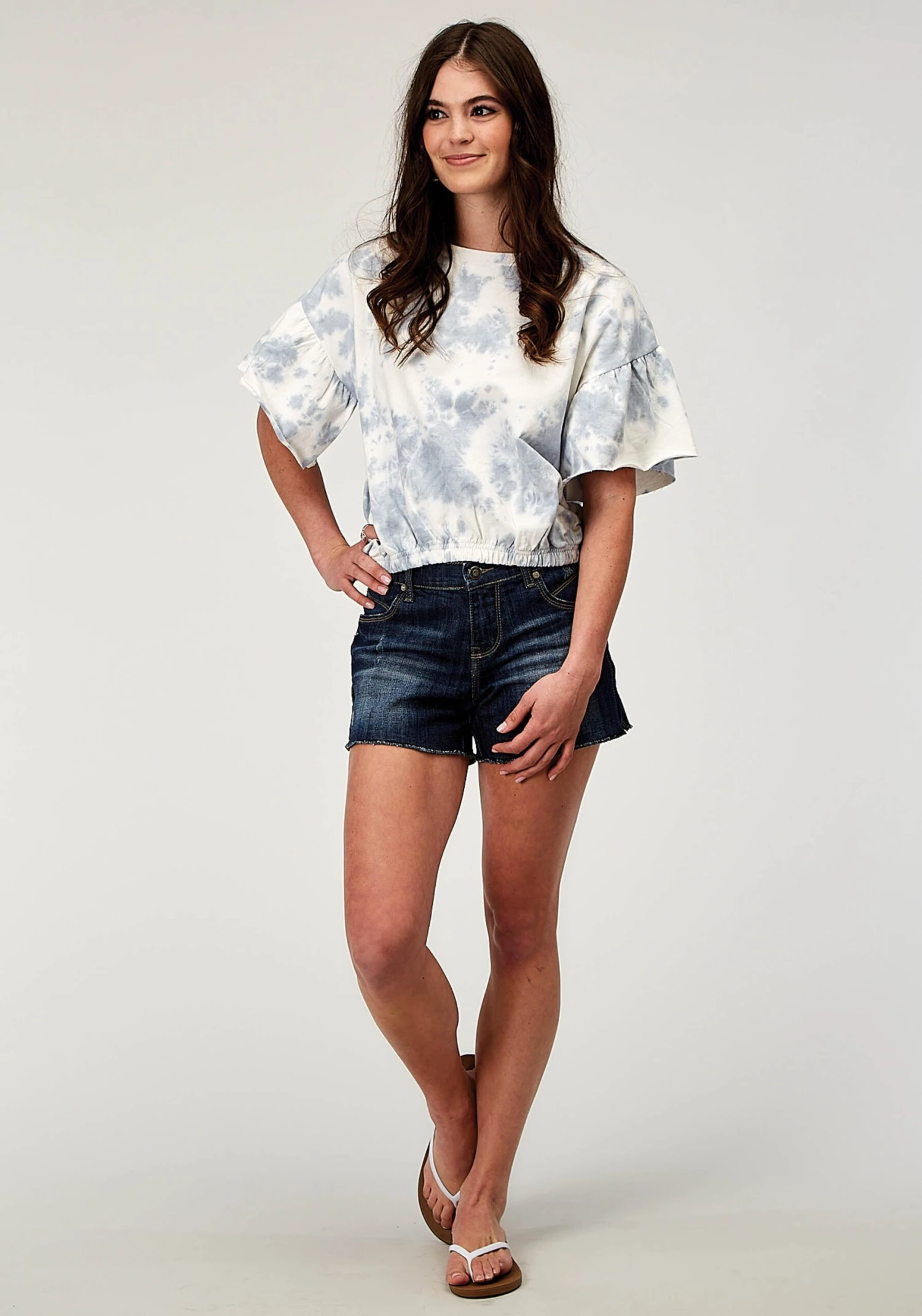 Women’s Blue/White Tie Dye French Terry Top * Crew Neck * Flutter Sleeve * Cropped Length With Elastic Hemline
