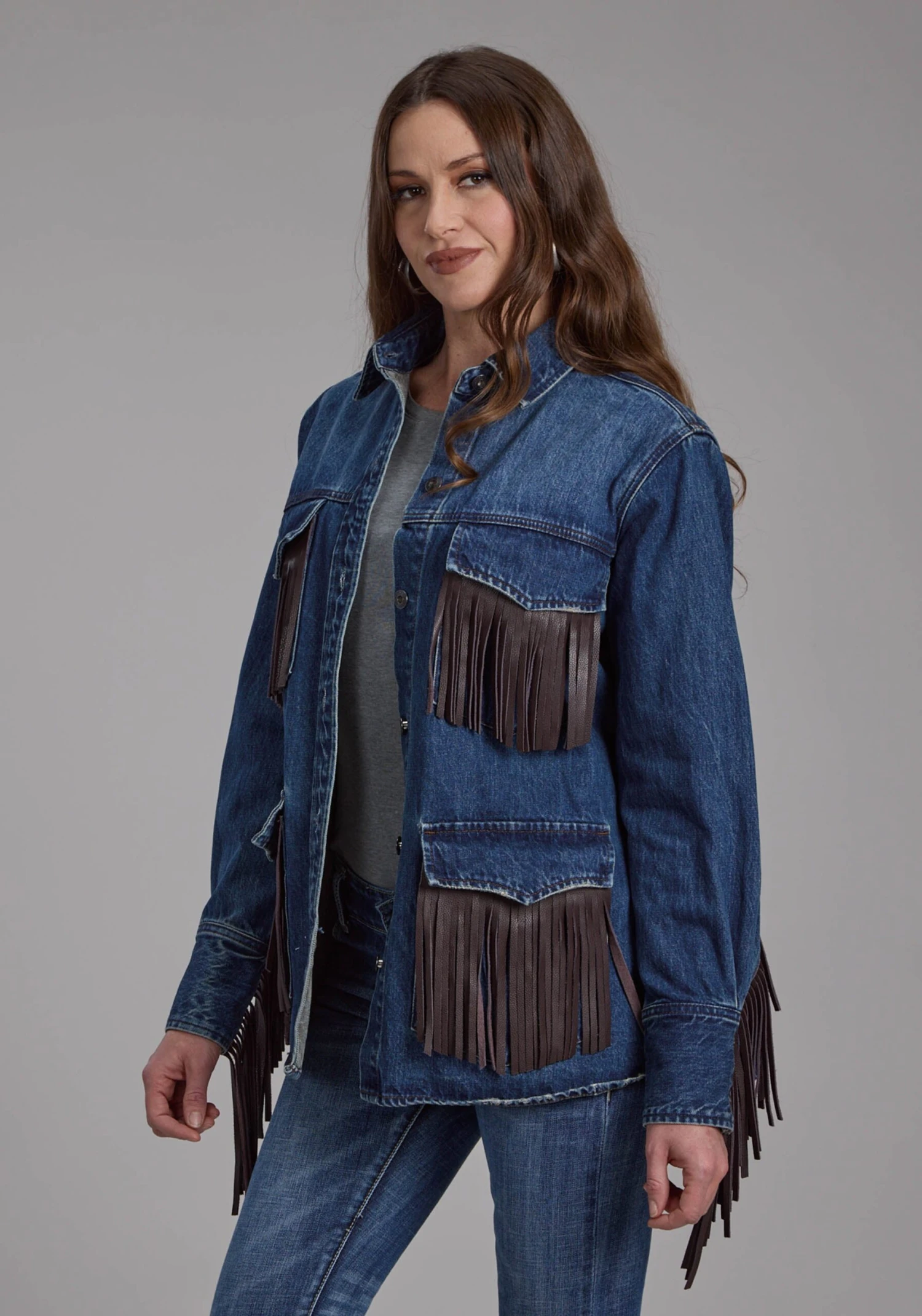 Women’s Denim Jacket * Hip Length * Straight Front Yoke And Single Point Back Yoke * 4 Front Patch Pockets With Flaps * Self Tie Belt * Brown Leather Fringe Below Each Pocket Flap, Beneath Back Yoke, And Along Lower Back Sleeves