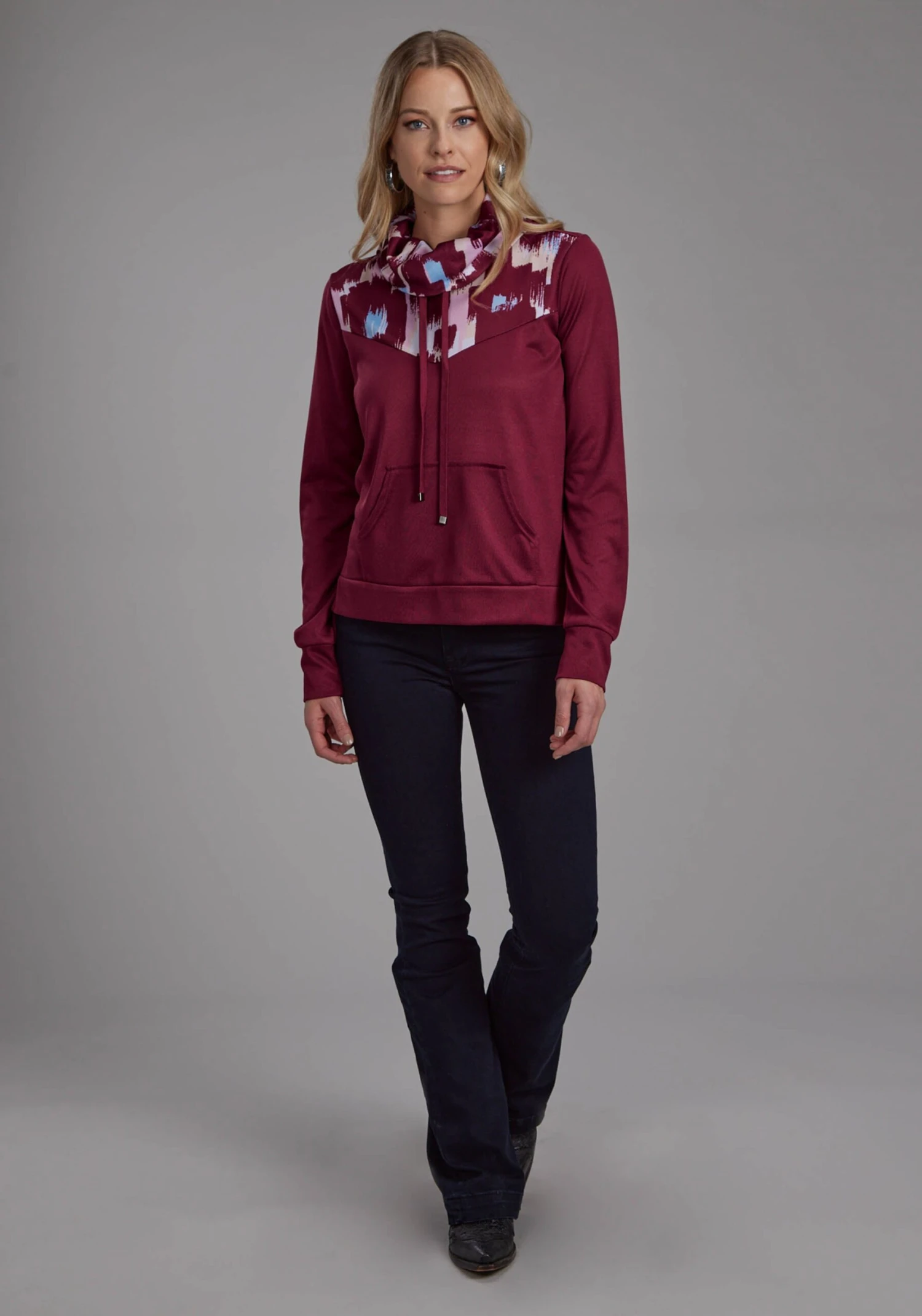 Women’s Comfy Cowl Neck Pullover In Wine Soft Sweater Jersey * Yoke And Collar Have Striking Oversized Wine Leopard Sublimation Print * Drawstring Neck * Front Pouch Pocket
