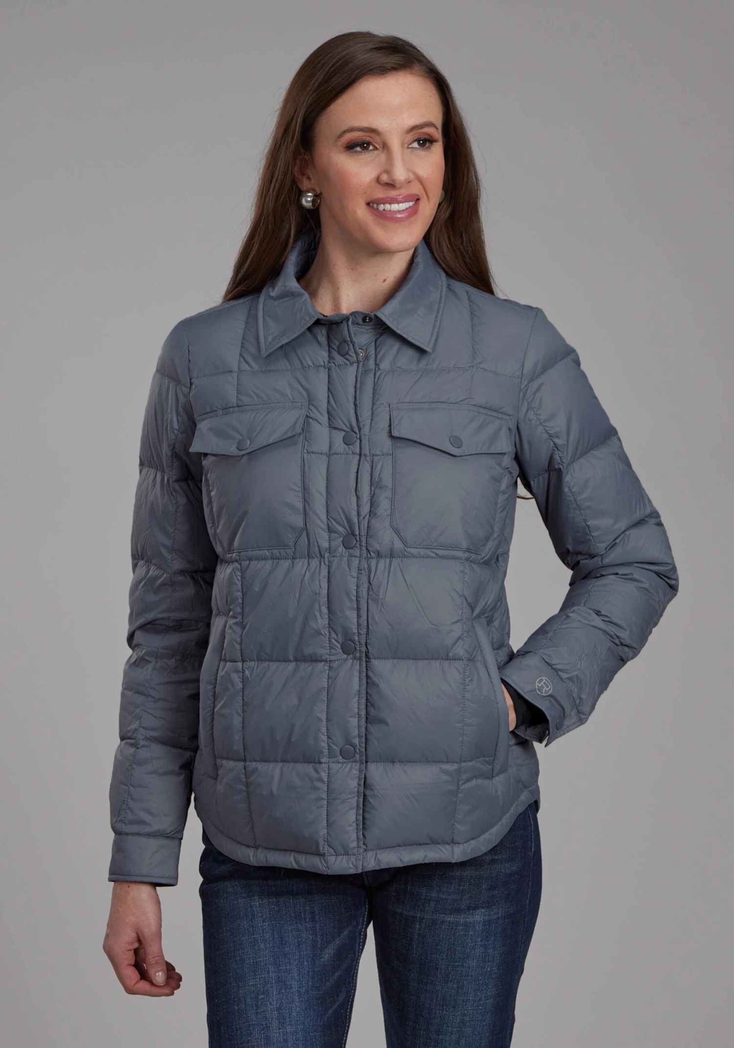 Women’s Lightweight Parachute Nylon Shirt Jckt * Down Filled * Square Quilted Lines * Self Nylon Lining * Stand Up Collar * Snp Frt * Square Pckts & Flaps On Chest * Frt Inset Hand Pckts W/Zip Closure * Rounded Hem * Reflective Screen Logo