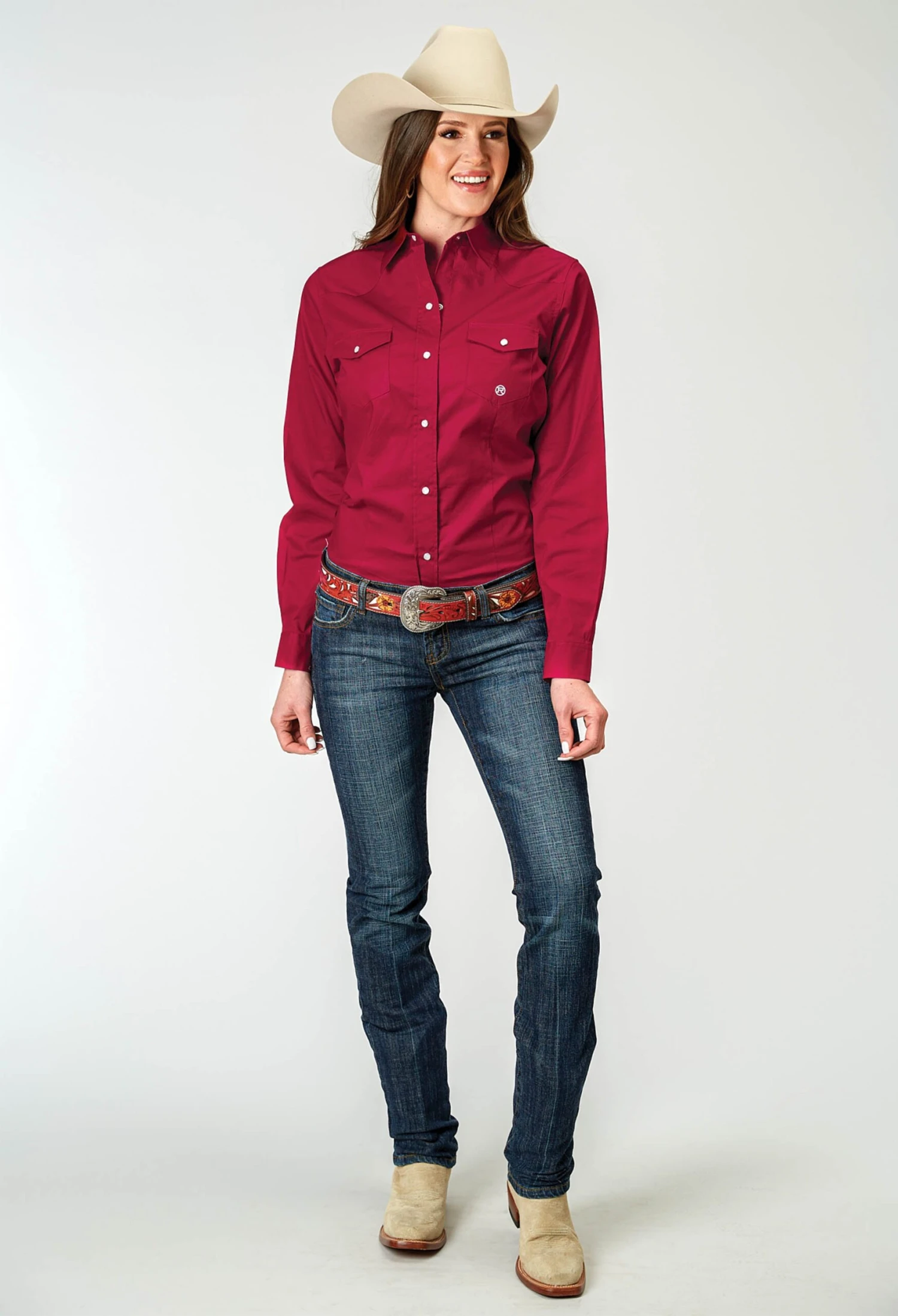 Women’s Long Sleeve Western Shirt * Snap Front * 1 Point Curved Front Yokes Into Neck * One Pt Back Yokes * One Point Flap Pockets * One Snap Cuffs * Front & Back Darts * Roper “R” Embroidery