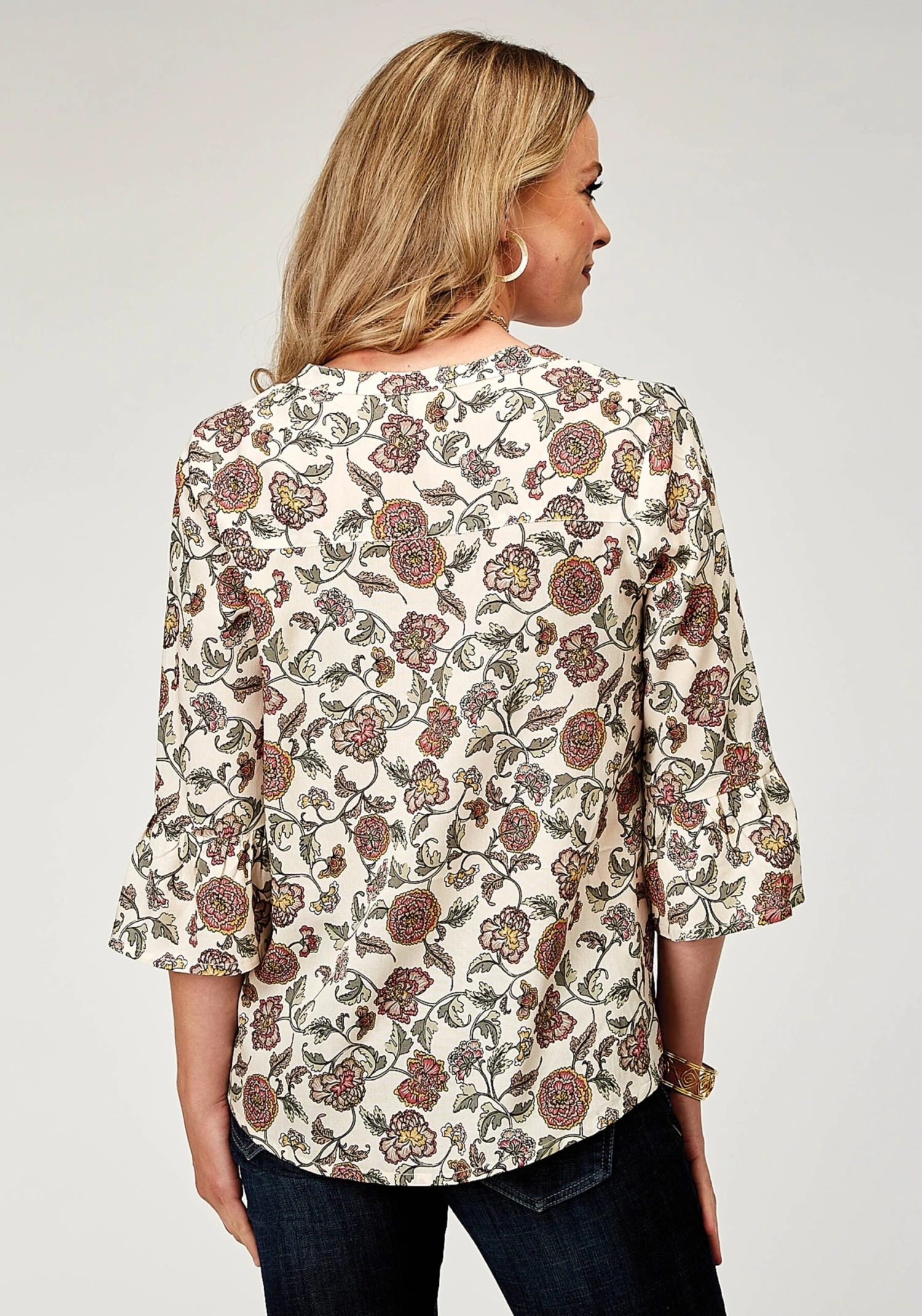 Women’s ¾ Bell Sleeve Pullover Shirt In Rayon Challis “Ditzy Floral” * Split V Placket With Banded Collar * Curved Hem