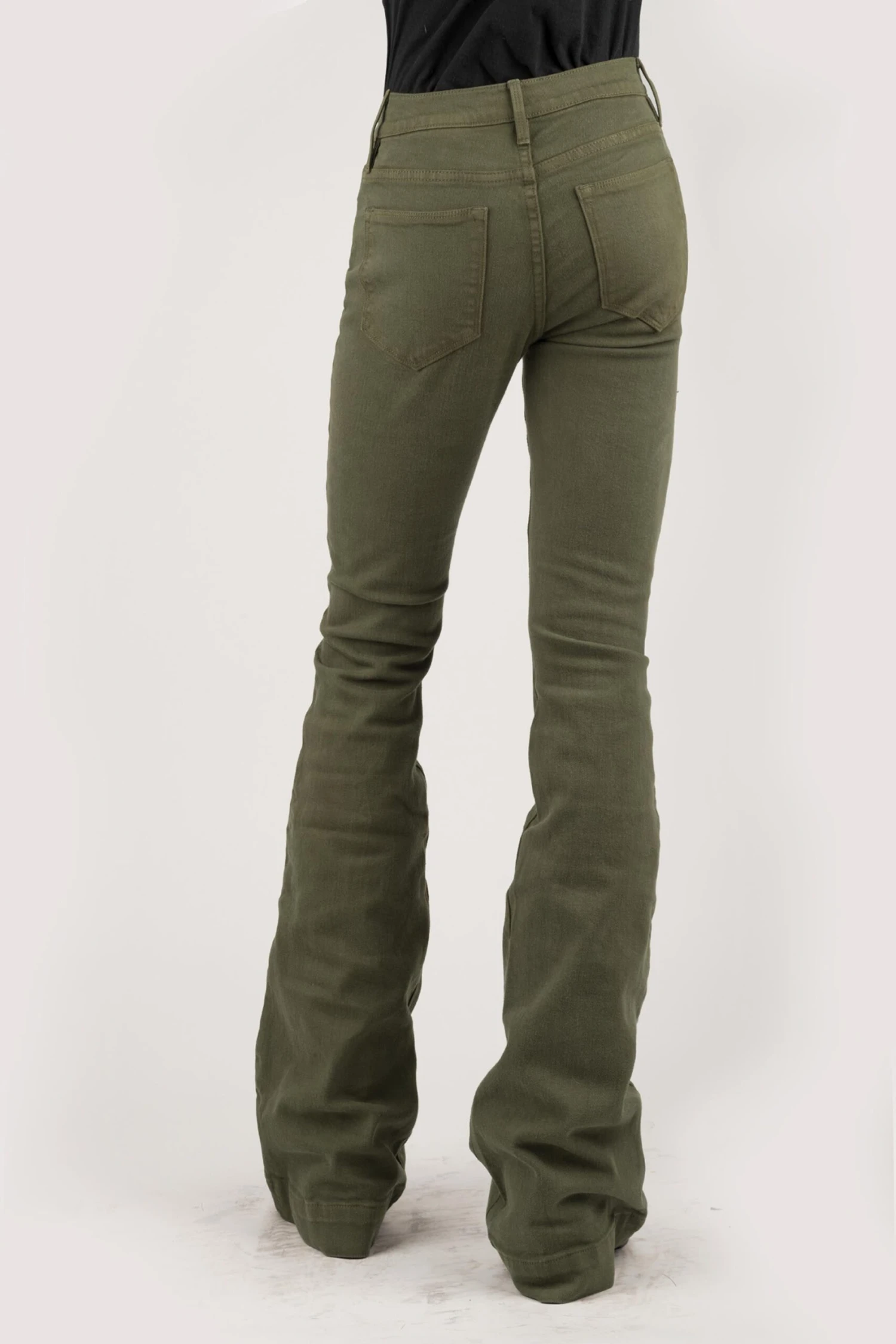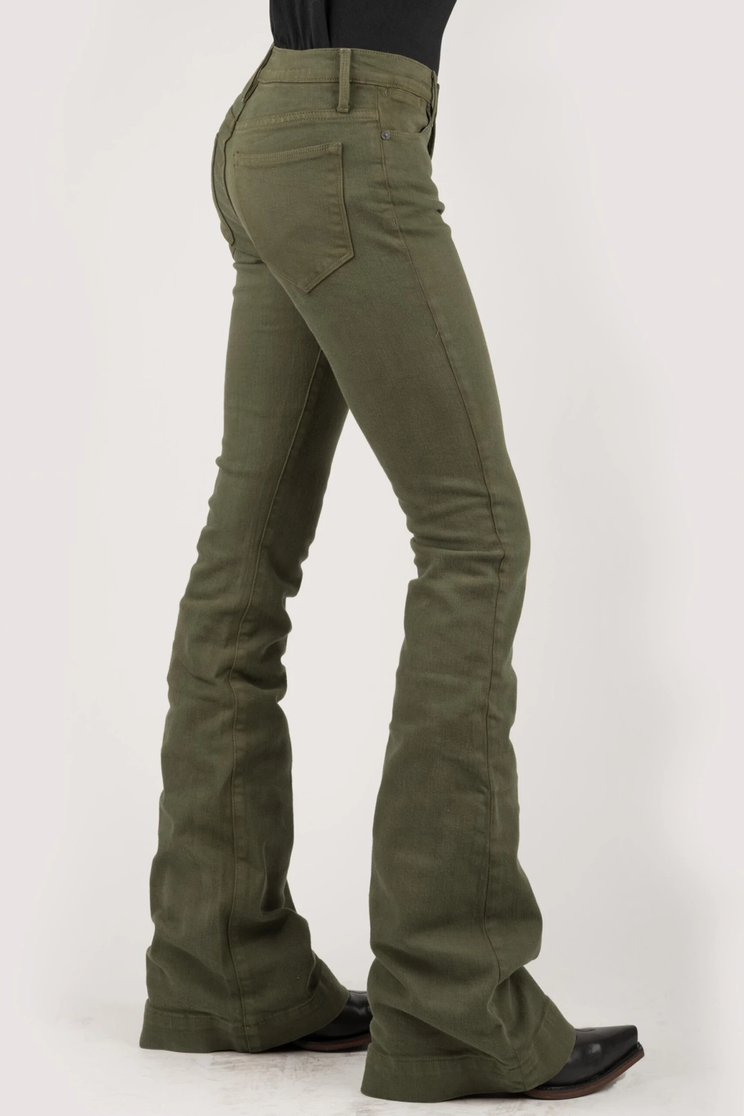 High Waist Flare Western Jean * Sits At Waist * Slim Fit Through Thigh & Knee W/Flare Leg Opening * 5 Pocket * Western Yoke Shapes * Plain Back Pockets * Stetson Branded Buttons, Rivets, & Zipper * Gentle Hand Sanding Details