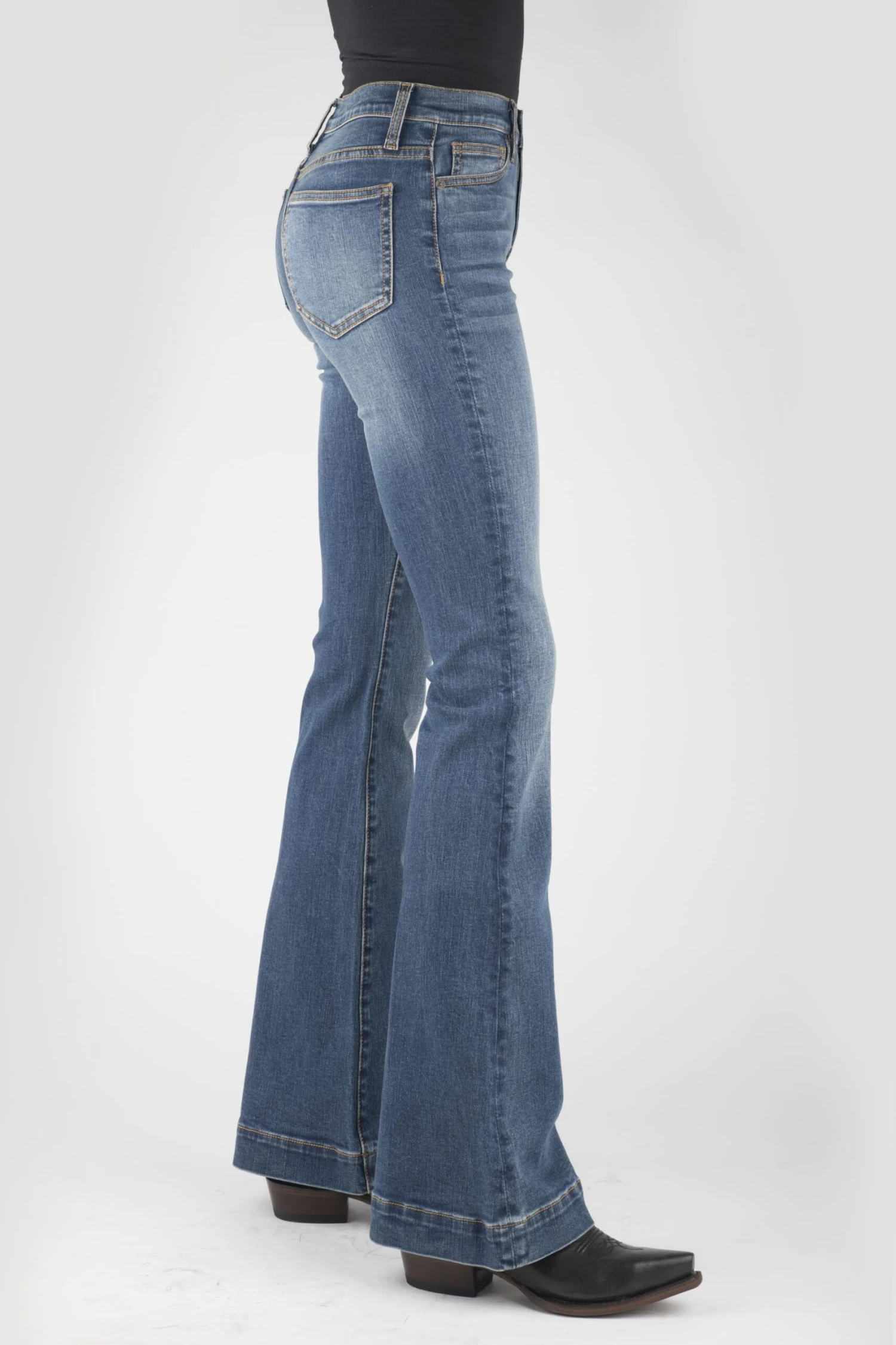 High Waist Flare Western Jean * Sits At Waist * Slim Fit Through Thigh And Knee With Flare Leg Opening * 5 Pocket * Plain Back Pocket * Stetson Branded Buttons, Rivets, And Zipper * Gentle Sanding And Whisker Details *