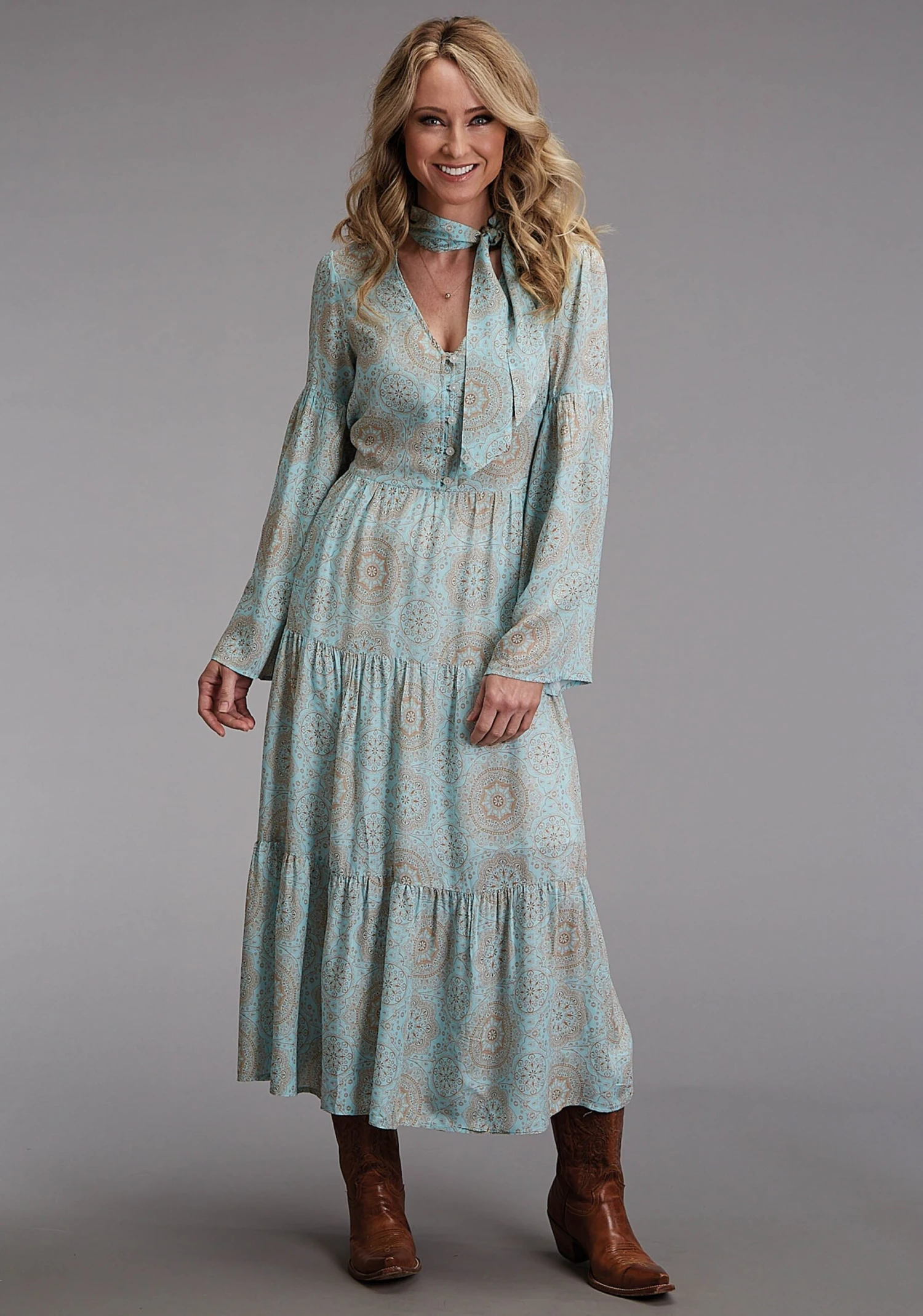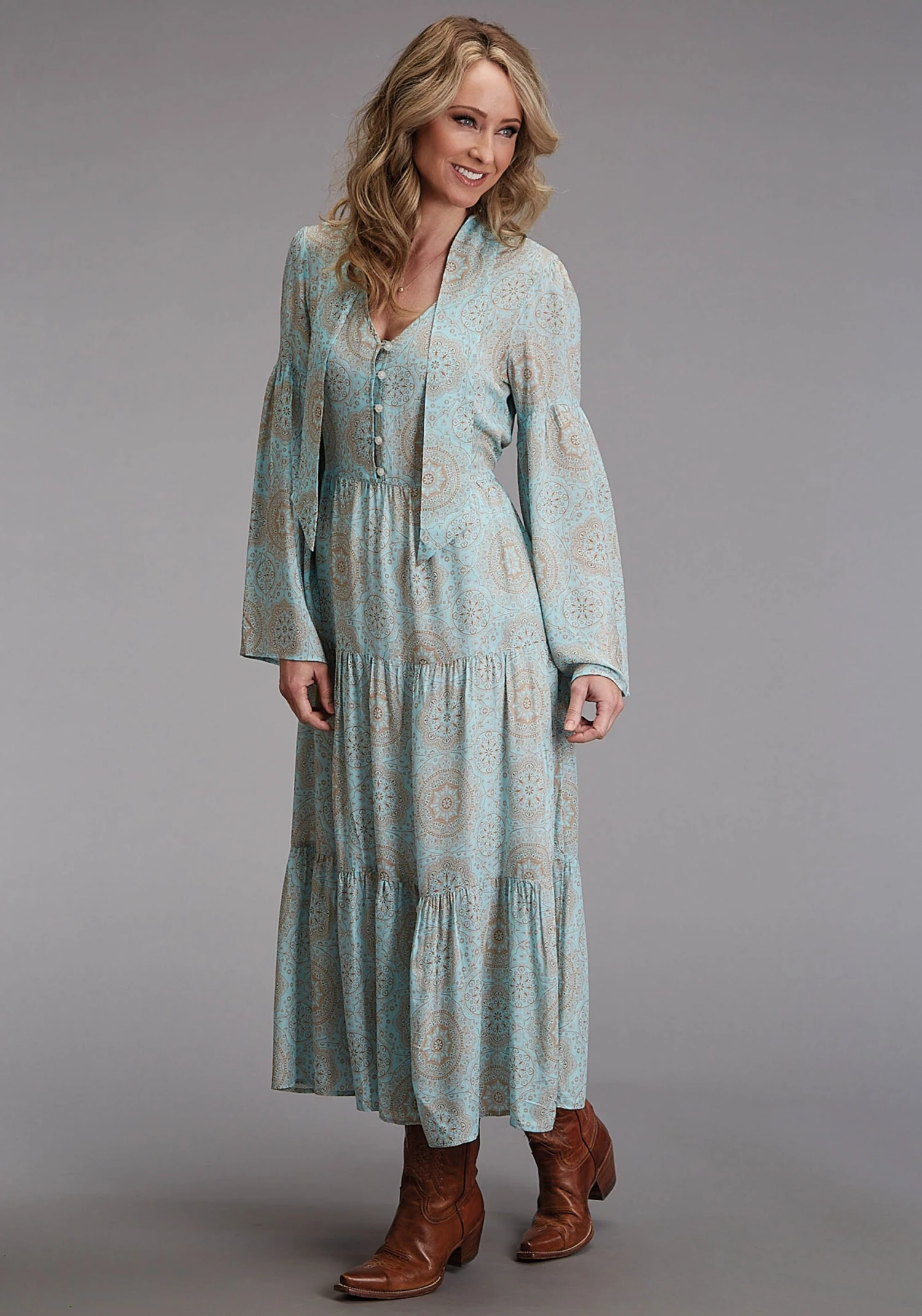 Women’s “Mandala” Print Rayon Long Dress * Stand Collar With Self Tie At Front * V-Neck With Button And Loop Closure To Waist * Oversized Bell Sleeves Gathered At Shoulders * Gathered 3 Tier Skirt